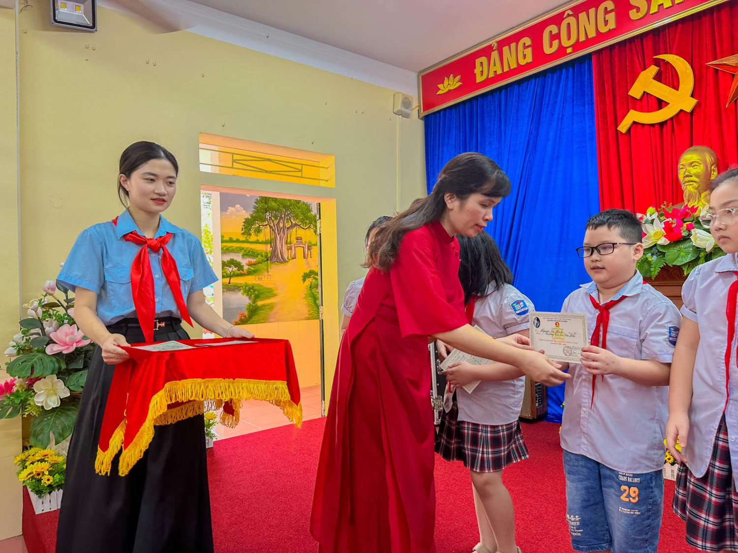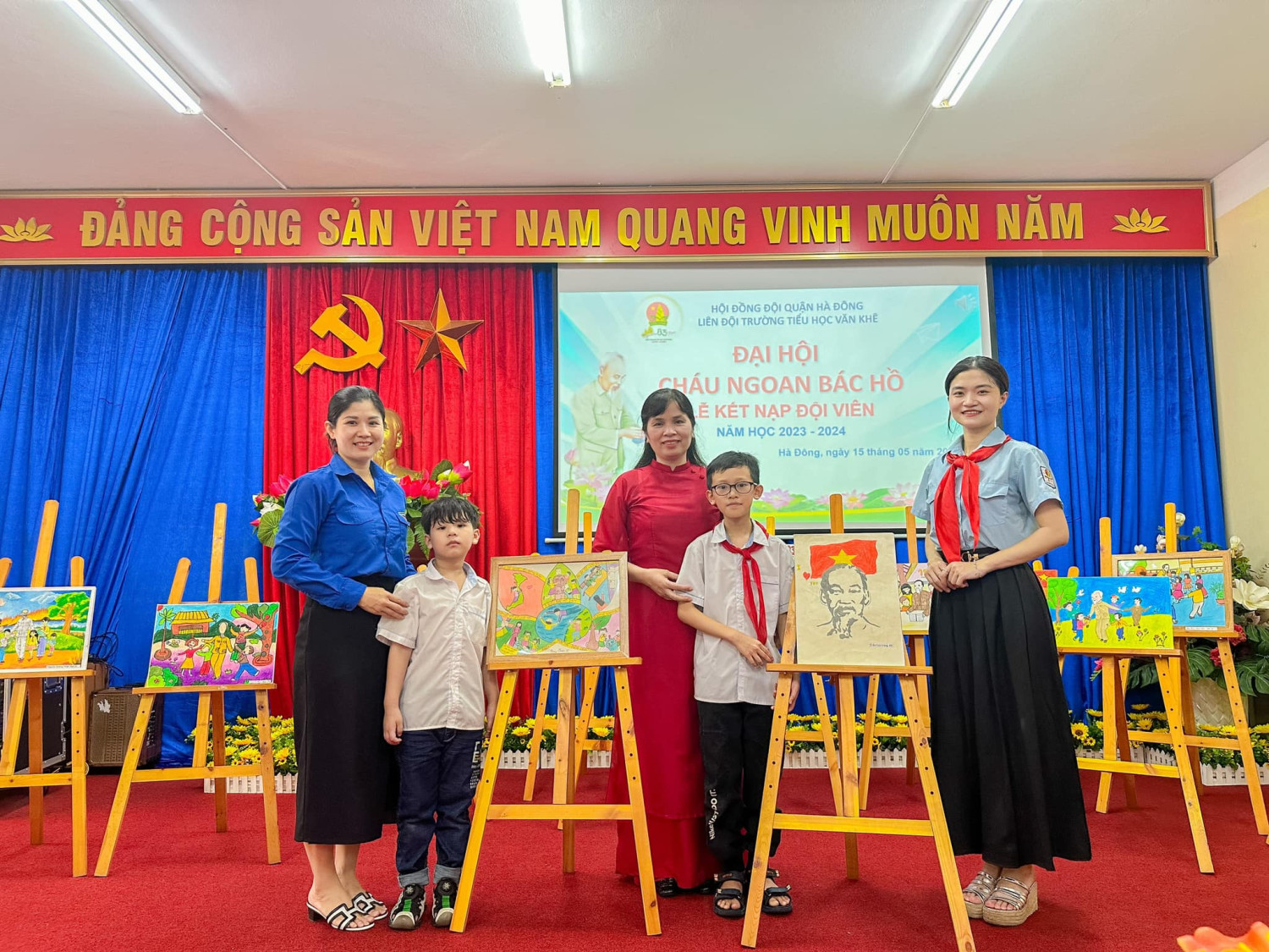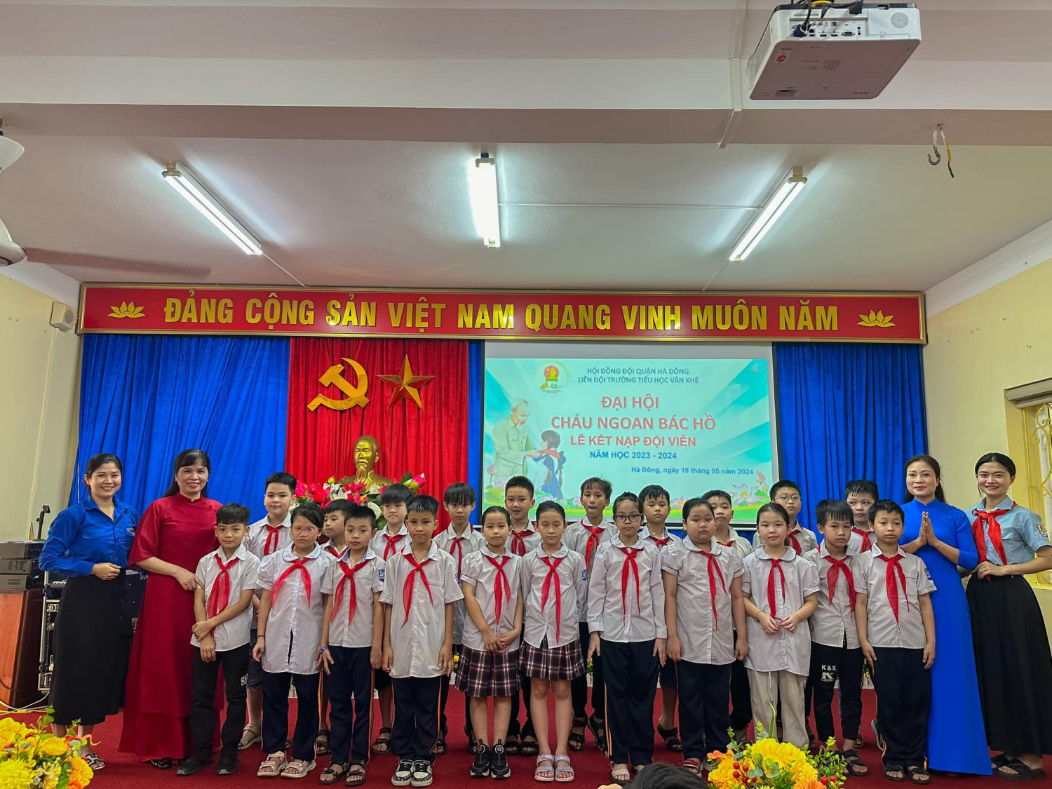 Xứng danh chuyên hiệu: Cháu ngoan Bác Hồ. Sáng ngày 15/5/2024, Liên Đội trường Tiểu học Văn Khê tổ chức Đại Hội Cháu ngoan Bác Hồ và Lễ Kết nạp Đội viên nhân kỉ niệm 83 năm ngày thành lập Đội TNTP HCM (15/5/1941 – 15/5/2024) và 134 năm ngày sinh Bác Hồ kính yêu (19/5/1890-19/4/2024). Đại hội cháu ngoan Bác Hồ được tổ chức nhằm tuyên dương những tấm gương tiêu biểu, có đóng góp tích cực cho phong trào của Đội trên các lĩnh vực công tác Đội và phong trào thiếu nhi như: Nghi thức, Sao đỏ, Sao nhi đồng, Văn nghệ, Hội họa, Thể thao…… Là dịp để đội viên, nhi đồng toàn Liên Đội kính dâng lên Đảng và Bác Hồ kính yêu những bông hoa thành tích xuất sắc được nhận chuyên hiệu: Cháu ngoan Bác Hồ. Tại Đại hội, 41 nhi đồng tiêu biểu được vinh dự đứng trong hàng ngũ của Đội sau thời gian rèn luyện phấn đấu để trở thành Đội viên TNTP Hồ Chí Minh. Sẽ là 1 kỉ niệm đáng nhớ, 1 dấu ấn không phai nhòa trong kí ức của các bạn khi được chính thức trở thành Đội viên đúng ngày thành lập Đội và được kết nạp trong Đại hội Cháu ngoan Bác Hồ. Trong khuôn khổ chương trình của đại hội, với dư âm của tháng 5 lịch sử chào mừng Lễ kỷ niệm 70 năm chiến thắng Điện Biên Phủ - Chiến thắng lừng lẫy năm châu, chấn động địa cầu, Toàn trường được xem thước phim quý giá về CUỘC ĐỜI VÀ SỰ NGHIỆP CÁCH MẠNG CỦA BÁC HỒ - VỊ LÃNH TỤ VĨ ĐẠI CỦA DÂN TỘC TA - DANH NHÂN VĂN HOÁ THẾ GIỚI. Trải qua bao thăng trầm, bôn ba của cuộc đời, Hồ Chủ Tịch đã tìm được con đường đúng đắn để đưa đất nước thoát khỏi xiềng xích nô lệ, giành được nền độc lập tự do thống nhất đất nước, chúng ta được sống trong hòa bình, ấm no, hạnh phúc. Đại hội diễn ra trong không khí trang nghiêm, lắng đọng, phấn khởi, nhiệt huyết của măng non đất nước và kết thúc thành công rực rỡ với những bông hoa tươi thắm nhất trong “vườn hoa Cháu ngoan Bác Hồ”, góp phần phát huy giá trị truyền thống tốt đẹp của quê hương và xứng đáng với sự kỳ vọng, mong đợi của các thế hệ đi trước. Xin mời quý vị cùng chiêm ngưỡng những khoảnh khắc tuyệt vời của Đại Hội ngày hôm nay 15/5/2024!