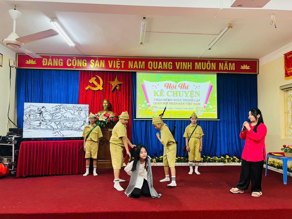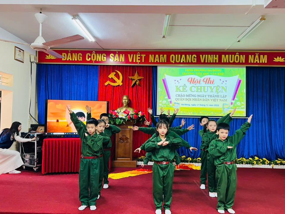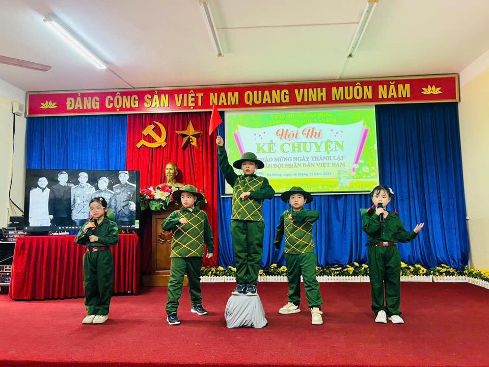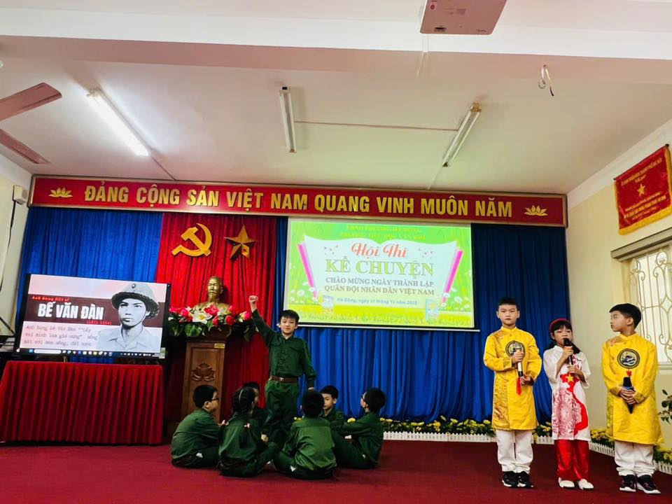 Giáo dục đạo đức, truyền thống yêu nước, lòng tự tôn dân tộc là một trong những nhiệm vụ quan trọng của nhà trường. Nhân dịp kỷ niệm 81 năm Ngày thành lập Quân đội Nhân dân Việt Nam, Ban Công tác Đội đã tổ chức Hội thi Kể chuyện chào mừng Ngày thành lập Quân đội Nhân dân Việt Nam. Hội thi thu hút đông đảo các lớp tham gia với những tiết mục được dàn dựng công phu, kết hợp lời kể truyền cảm, trình chiếu và hoạt cảnh minh hoạ sinh động. Nhiều tiết mục đã để lại ấn tượng sâu sắc, khiến Ban giám khảo, thầy cô và Quý phụ huynh không khỏi nghẹn ngào xúc động: hình ảnh người mẹ tiễn con ra chiến trường không ngày trở lại; mười cô gái Thanh niên xung phong anh dũng hy sinh tại Ngã ba Đồng Lộc; anh hùng Bế Văn Đàn lấy thân mình làm giá súng; anh hùng Võ Thị Sáu kiên trung; cùng sự giản dị, cao cả của Bác Hồ kính yêu. Sau hai buổi chiều tổ chức, hội thi khép lại trong niềm lắng đọng và xúc động. Những câu chuyện thiêng liêng về người lính, về sự hy sinh cao cả của các thế hệ cha anh vẫn còn ngân vang, lặng lẽ thắp lên trong trái tim các em học sinh ngọn lửa yêu nước, niềm tự hào dân tộc và lòng biết ơn sâu sắc, để các em thêm trân trọng hòa bình hôm nay và không ngừng nỗ lực học tập, rèn luyện, tiếp nối truyền thống vẻ vang của quê hương, đất nước. Dưới đây là một số hình ảnh được ghi lại – những khoảnh khắc lắng đọng, giàu cảm xúc, lưu giữ trọn vẹn tinh thần của hội thi và những dư âm đẹp đẽ còn đọng mãi trong lòng thầy cô, phụ huynh và các em học sinh thân yêu.