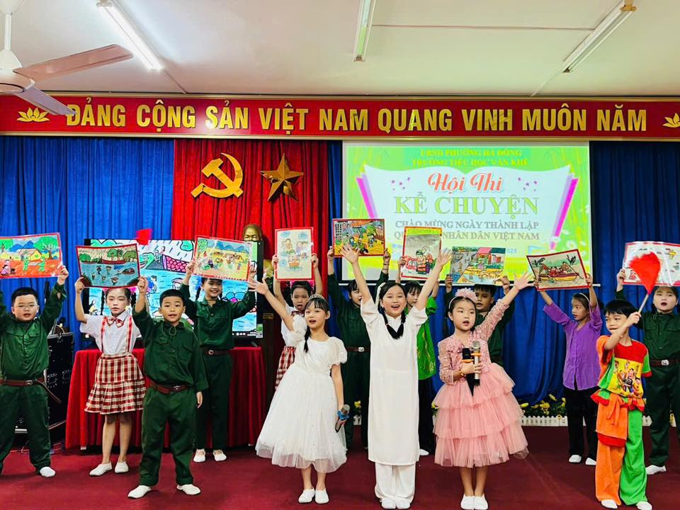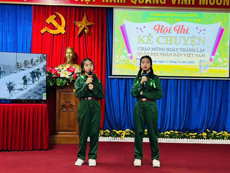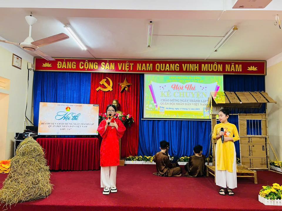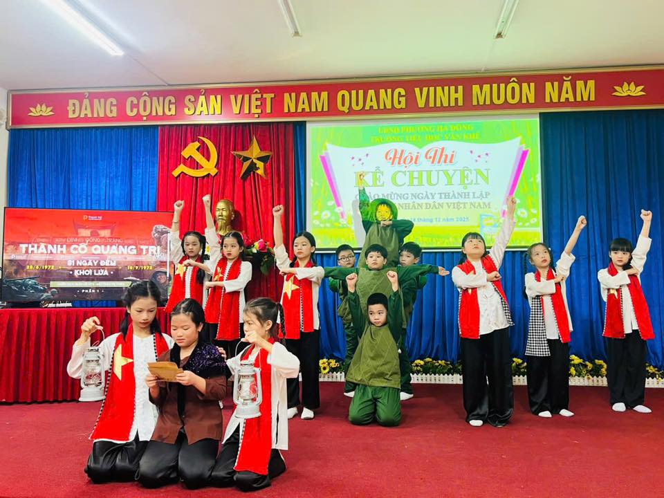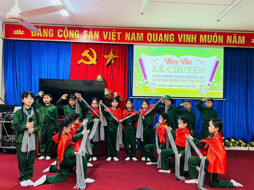 Giáo dục đạo đức, truyền thống yêu nước, lòng tự tôn dân tộc là một trong những nhiệm vụ quan trọng của nhà trường. Nhân dịp kỷ niệm 81 năm Ngày thành lập Quân đội Nhân dân Việt Nam, Ban Công tác Đội đã tổ chức Hội thi Kể chuyện chào mừng Ngày thành lập Quân đội Nhân dân Việt Nam. Hội thi thu hút đông đảo các lớp tham gia với những tiết mục được dàn dựng công phu, kết hợp lời kể truyền cảm, trình chiếu và hoạt cảnh minh hoạ sinh động. Nhiều tiết mục đã để lại ấn tượng sâu sắc, khiến Ban giám khảo, thầy cô và Quý phụ huynh không khỏi nghẹn ngào xúc động: hình ảnh người mẹ tiễn con ra chiến trường không ngày trở lại; mười cô gái Thanh niên xung phong anh dũng hy sinh tại Ngã ba Đồng Lộc; anh hùng Bế Văn Đàn lấy thân mình làm giá súng; anh hùng Võ Thị Sáu kiên trung; cùng sự giản dị, cao cả của Bác Hồ kính yêu. Sau hai buổi chiều tổ chức, hội thi khép lại trong niềm lắng đọng và xúc động. Những câu chuyện thiêng liêng về người lính, về sự hy sinh cao cả của các thế hệ cha anh vẫn còn ngân vang, lặng lẽ thắp lên trong trái tim các em học sinh ngọn lửa yêu nước, niềm tự hào dân tộc và lòng biết ơn sâu sắc, để các em thêm trân trọng hòa bình hôm nay và không ngừng nỗ lực học tập, rèn luyện, tiếp nối truyền thống vẻ vang của quê hương, đất nước. Dưới đây là một số hình ảnh được ghi lại – những khoảnh khắc lắng đọng, giàu cảm xúc, lưu giữ trọn vẹn tinh thần của hội thi và những dư âm đẹp đẽ còn đọng mãi trong lòng thầy cô, phụ huynh và các em học sinh thân yêu.