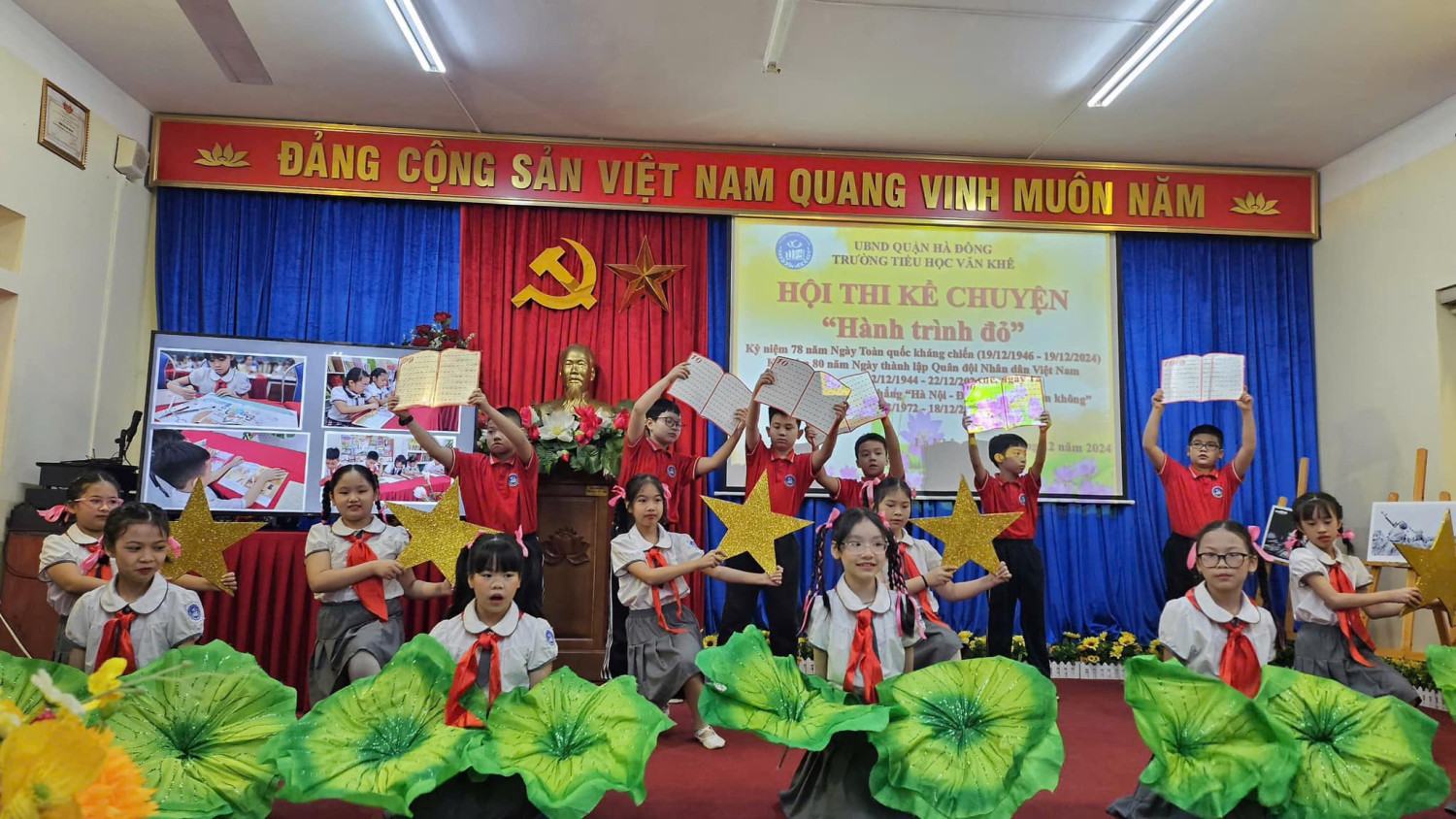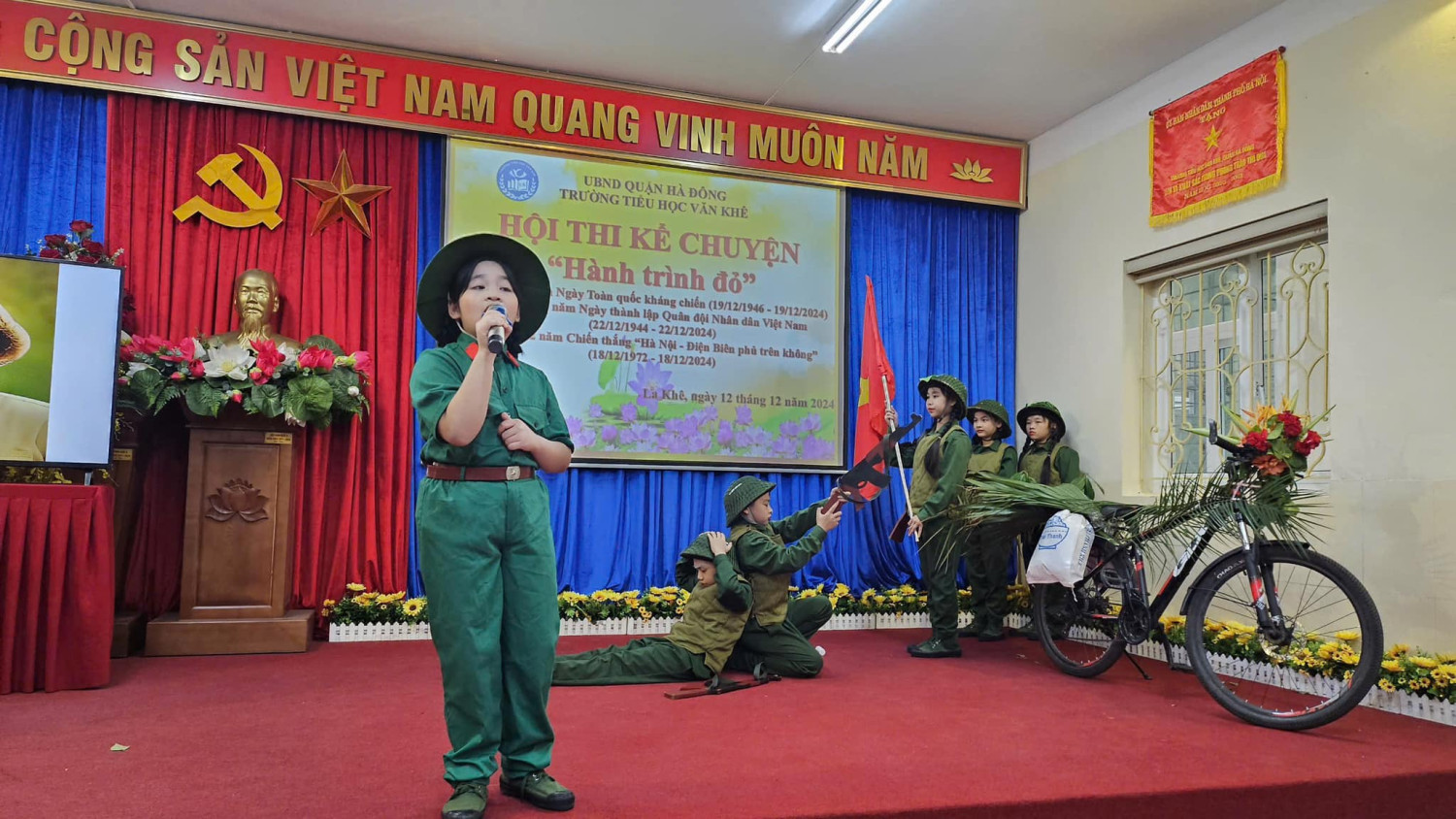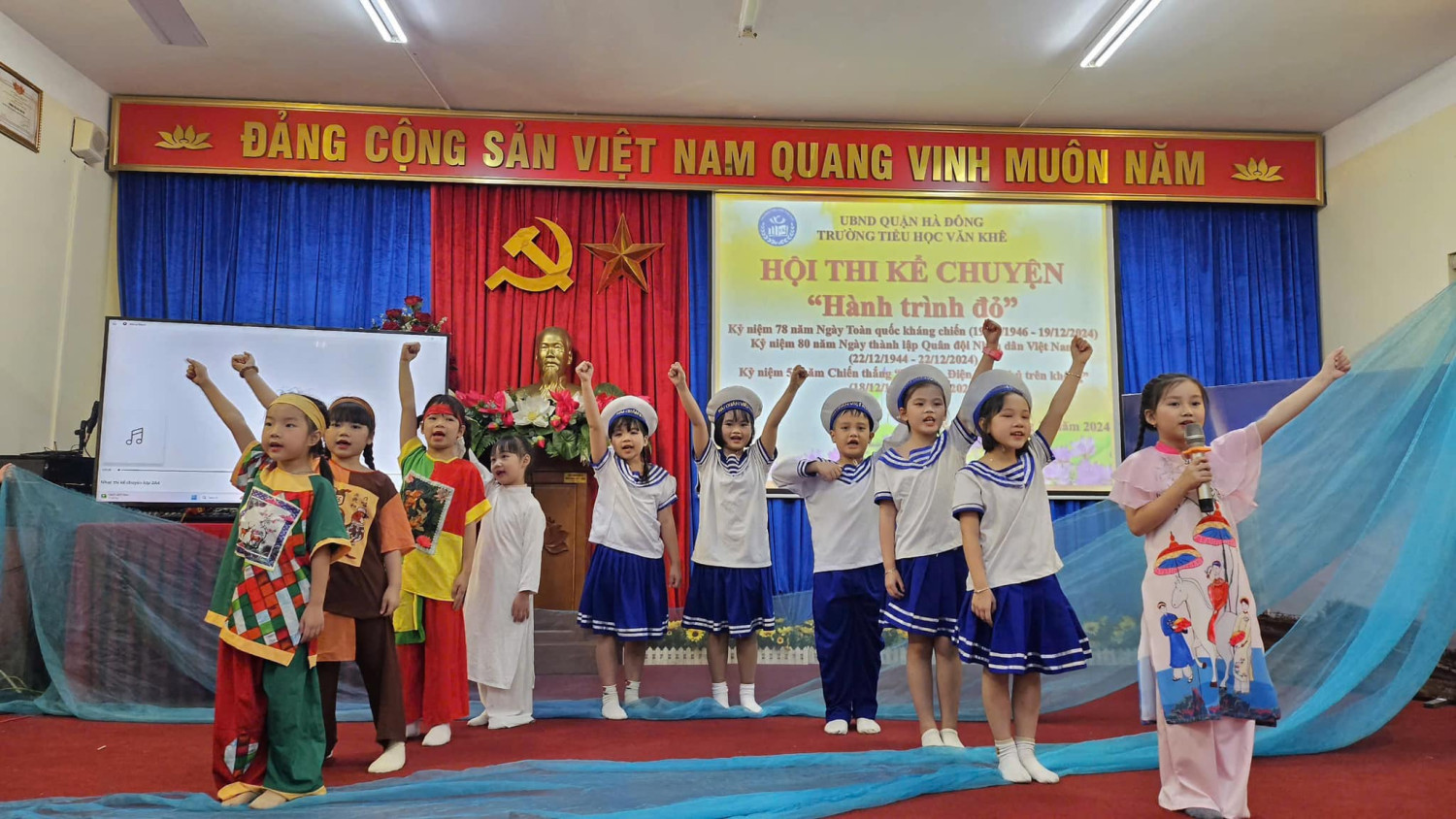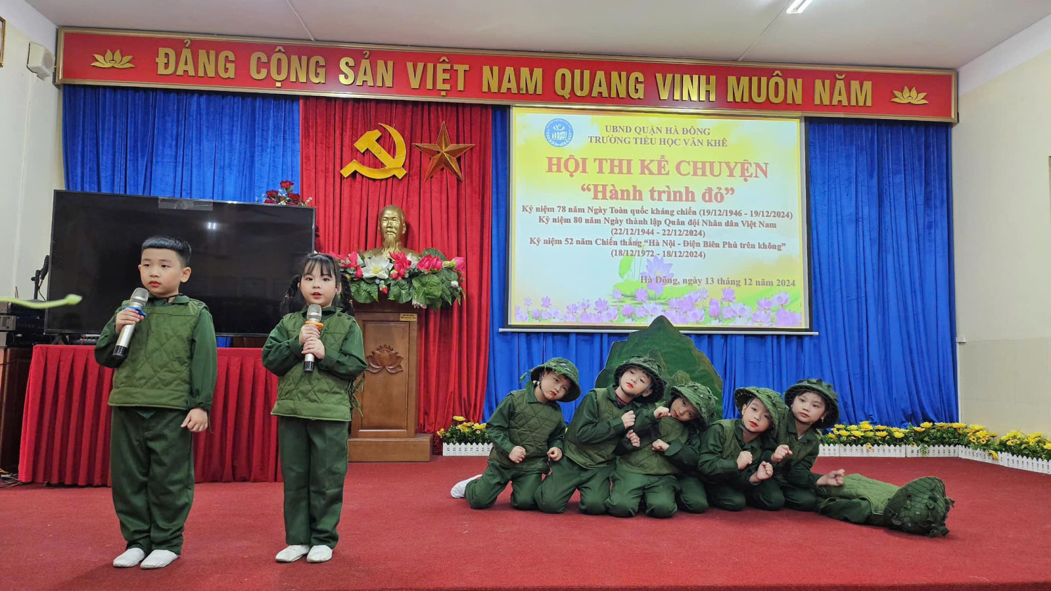 Hướng tới kỷ niệm 80 năm ngày thành lập Quân đội nhân dân Việt Nam ( 22/12/1944 - 22/12/2024) Với sự sáng tạo, tâm huyết của các cô giáo cùng sự chung tay góp sức của Quý phụ huynh Hội thi kể chuyện với chủ đề: HÀNH TRÌNH ĐỎ đã thực sự trở thành một hoạt động vô cùng ý nghĩa đối với mỗi học sinh trường Tiểu học Văn Khê. Đến với Hội thi các lớp đã tái hiện và kể lại những câu chuyện vô cùng ý nghĩa và sâu lắng. 35 lớp là 35 tiết mục, mỗi tiết mục đều được dàn dựng công phu và sâu trong đó ẩn chứa lòng biết ơn sâu sắc với các thế hệ cha ông ta đã ngã xuống vì nền độc lập dân tộc hay ngay cả những chiến sĩ trong thời bình. Hình ảnh anh Tô Vĩnh Diện hô anh em “Thà hy sinh, quyết bảo vệ pháo” và buông tay lái chạy lên phía trước, lấy thân mình lao vào chèn bánh pháo. Hay chị Võ Thị Sáu - Liệt sĩ nữ Anh hùng tiêu biểu trong cuộc kháng chiến chống Pháp. Người con gái vùng đất đỏ kiên cường bất khuất. Mười cô gái thanh niên xung phong tại ngã ba Đồng Lộc!… Những cống hiến, hy sinh của chiến sĩ trong cơn bão số 3 Yagi