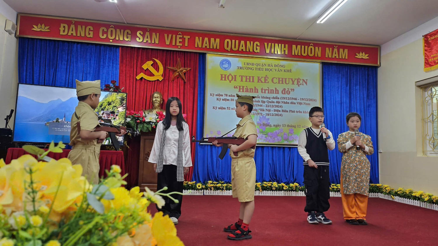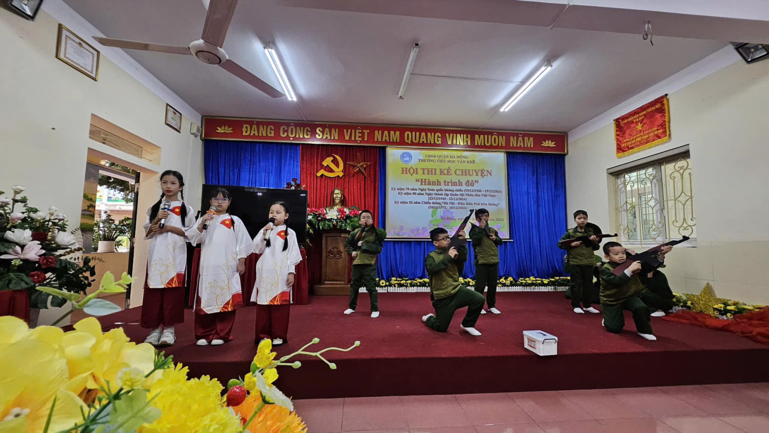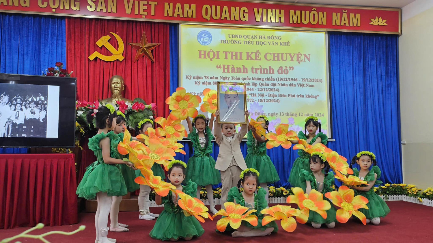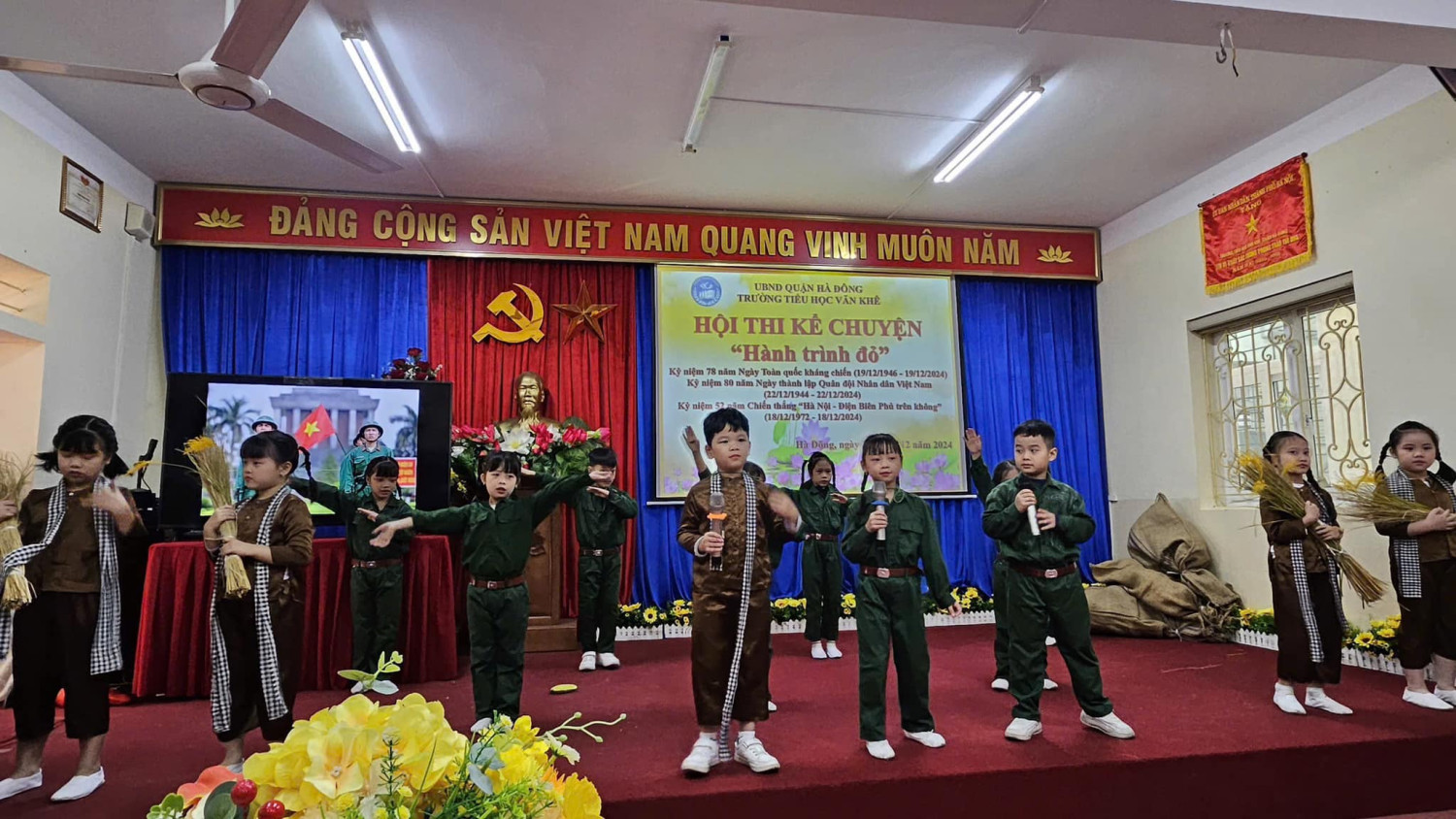 Hướng tới kỷ niệm 80 năm ngày thành lập Quân đội nhân dân Việt Nam ( 22/12/1944 - 22/12/2024) Với sự sáng tạo, tâm huyết của các cô giáo cùng sự chung tay góp sức của Quý phụ huynh Hội thi kể chuyện với chủ đề: HÀNH TRÌNH ĐỎ đã thực sự trở thành một hoạt động vô cùng ý nghĩa đối với mỗi học sinh trường Tiểu học Văn Khê. Đến với Hội thi các lớp đã tái hiện và kể lại những câu chuyện vô cùng ý nghĩa và sâu lắng. 35 lớp là 35 tiết mục, mỗi tiết mục đều được dàn dựng công phu và sâu trong đó ẩn chứa lòng biết ơn sâu sắc với các thế hệ cha ông ta đã ngã xuống vì nền độc lập dân tộc hay ngay cả những chiến sĩ trong thời bình. Hình ảnh anh Tô Vĩnh Diện hô anh em “Thà hy sinh, quyết bảo vệ pháo” và buông tay lái chạy lên phía trước, lấy thân mình lao vào chèn bánh pháo. Hay chị Võ Thị Sáu - Liệt sĩ nữ Anh hùng tiêu biểu trong cuộc kháng chiến chống Pháp. Người con gái vùng đất đỏ kiên cường bất khuất. Mười cô gái thanh niên xung phong tại ngã ba Đồng Lộc!… Những cống hiến, hy sinh của chiến sĩ trong cơn bão số 3 Yagi