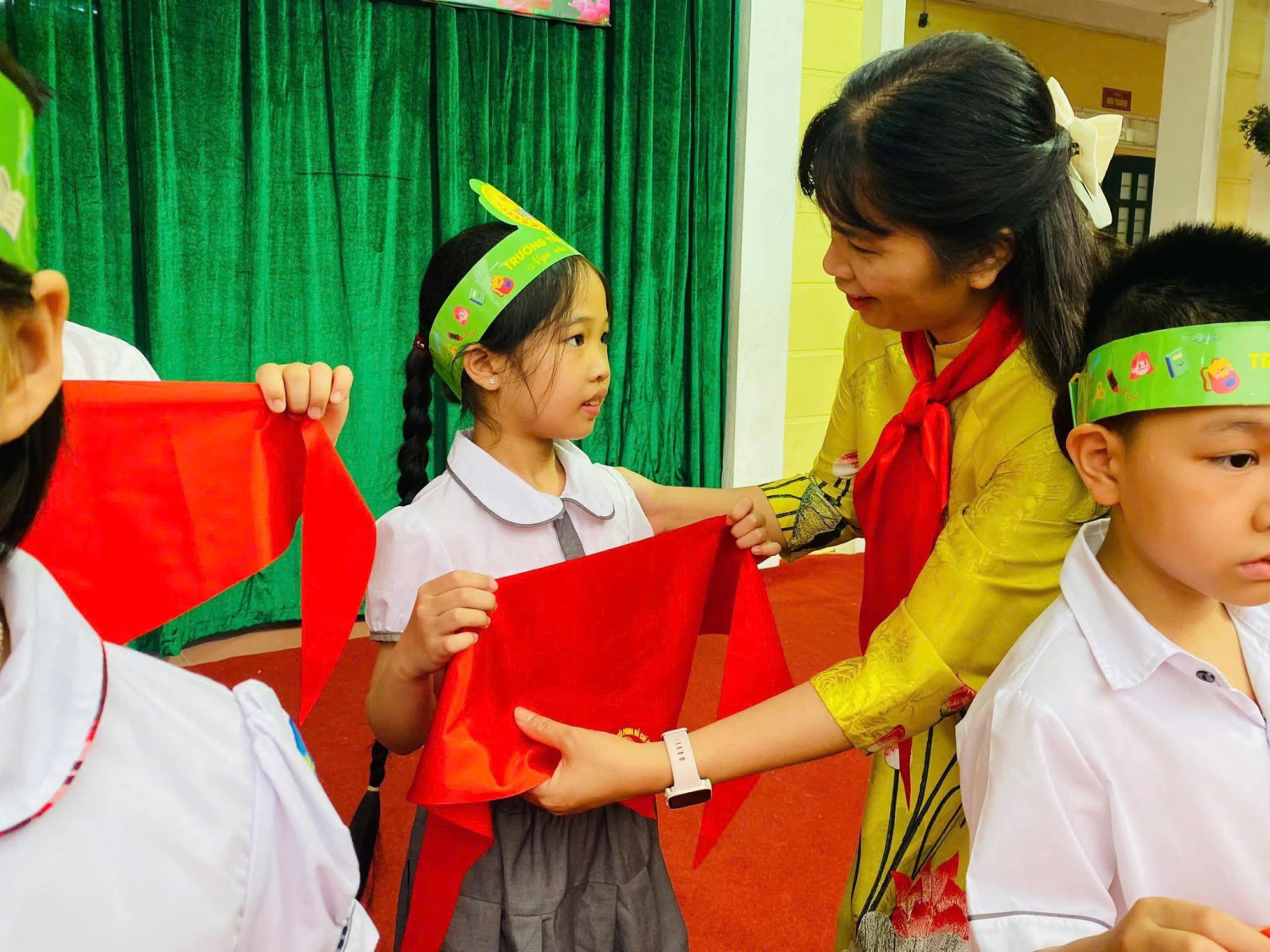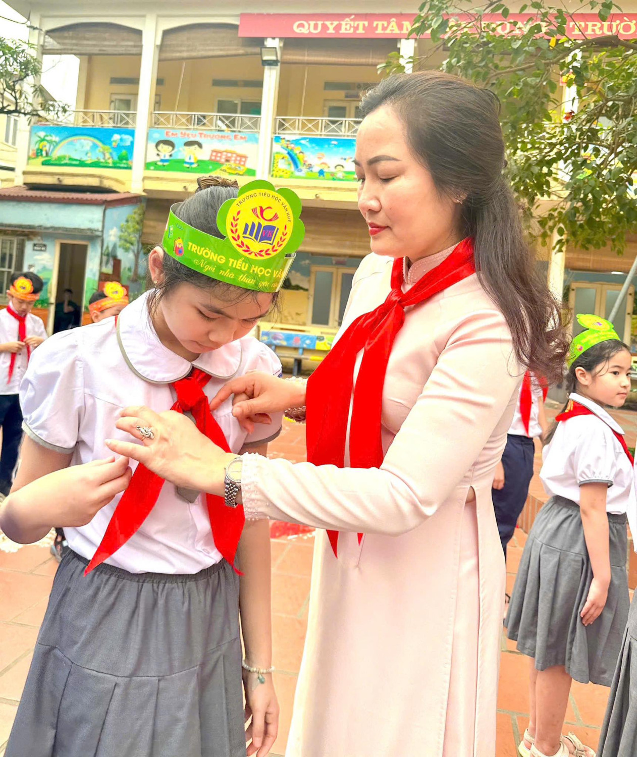 Chúc các em luôn chăm ngoan, học giỏi, tích cực rèn luyện để trở thành con ngoan, trò giỏi, cháu ngoan Bác Hồ! Tự hào khoác trên vai chiếc khăn quàng đỏ – Tự tin viết tiếp hành trình măng non! Hãy cùng ngắm nhìn các gương mặt rạng rỡ, tự hào của đội viên trong khoảnh khắc thiêng liêng mới!