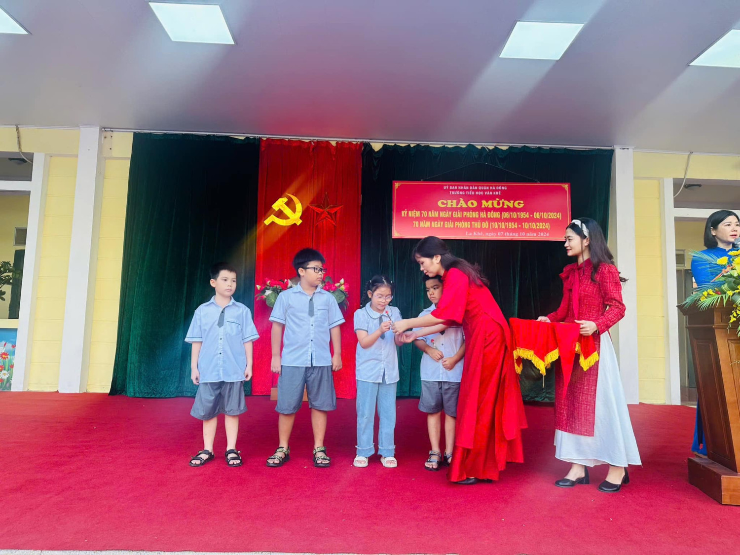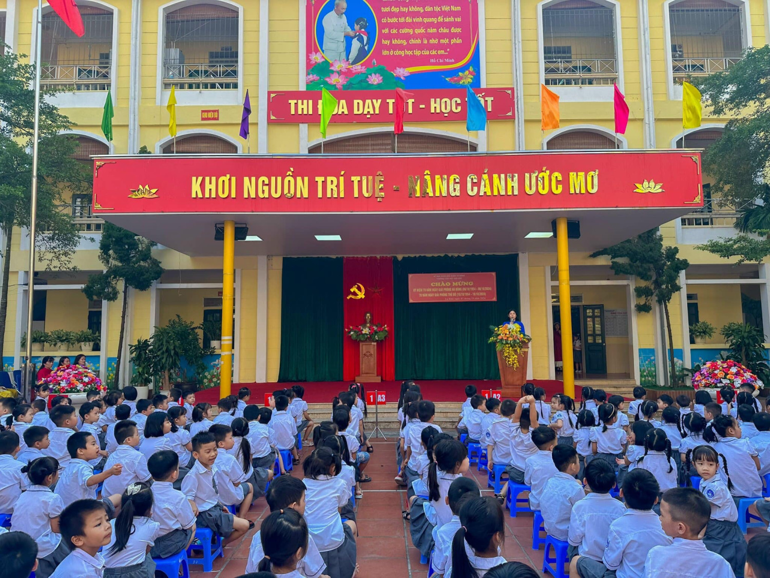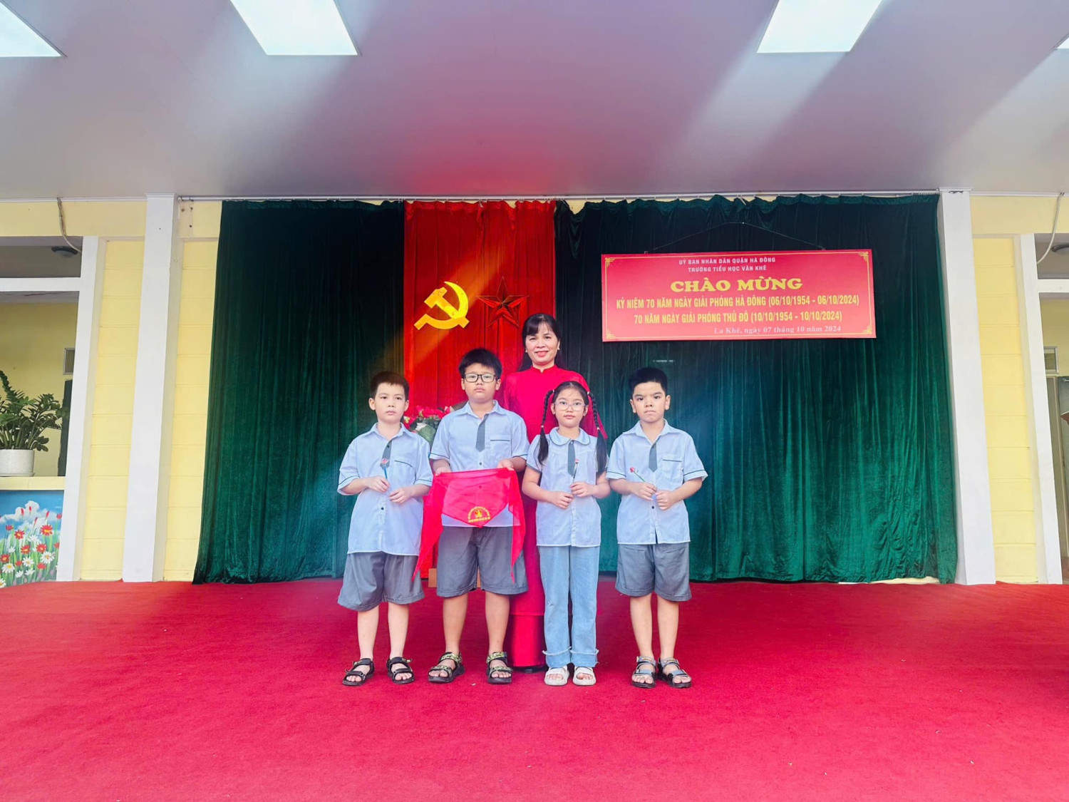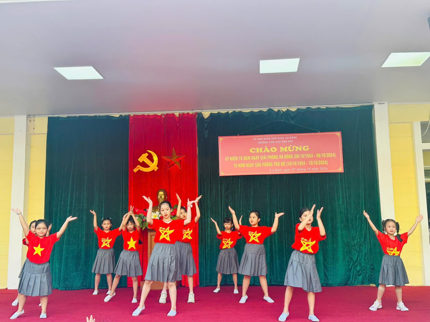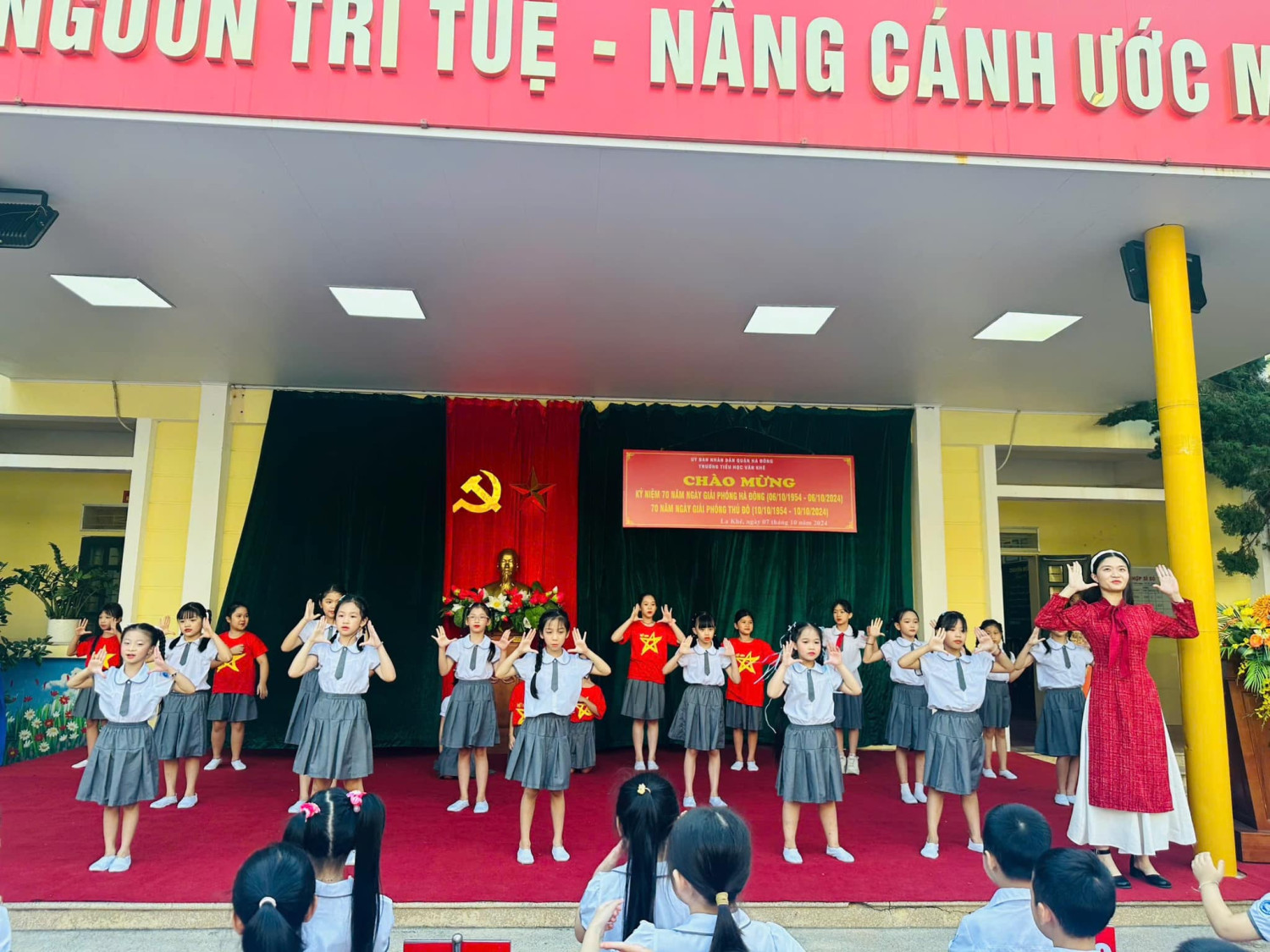 Lễ kỷ niệm được tổ chức trong tiết Sinh hoạt dưới cờ thứ Hai ngày 07/10/2024 hết sức trang trọng, tiết kiệm, thiết thực, hiệu quả, gắn với các hoạt động tuyên truyền kỷ niệm 70 năm Ngày Giải phóng Hà Đông và 70 năm ngày giải phóng Thủ đô; tạo không khí phấn khởi, tươi vui cho thầy và trò nhà trường. Buổi lễ nhằm tuyên truyền, giáo dục sâu rộng trong cán bộ, đảng viên, giáo viên, nhân viên và học sinh toàn trường về ý nghĩa to lớn của Ngày Giải phóng Thủ đô; khẳng định sự lãnh đạo sáng suốt của Đảng Cộng sản Việt Nam, Chủ tịch Hồ Chí Minh, tinh thần Đại đoàn kết toàn dân tộc, ý chí, quyết tâm và sức mạnh của Quân đội nhân dân Việt Nam là nhân tố quyết định mọi thắng lợi của cách mạng Việt Nam; khẳng định những thành tựu vĩ đại của Đảng và dân tộc ta đã đạt được trong sự nghiệp đấu tranh giải phóng dân tộc - thống nhất đất nước, xây dựng và bảo vệ Tổ quốc Việt Nam xã hội chủ nghĩa, nhất là trong gần 40 năm tiến hành công cuộc đổi mới đất nước ta. Kết thúc bài phát biểu, cô giáo Trần Thị Quyên - Bí thư Chi bộ - Hiệu trưởng nhà trường chia sẻ năm nay do CƠN BÃO SỐ 3 để lại NHỮNG HẬU QUẢ NẶNG NỀ VỀ NGƯỜI VÀ TÀI SẢN, ẢNH HƯỞNG RẤT LỚN ĐẾN ĐỜI SỐNG VẬT CHẤT VÀ TINH THẦN của nhân dân ta. Do đó Lễ kỷ niệm 70 năm ngày Giải phóng Thủ đô được tổ chức TRANG TRỌNG, Ý NGHĨA, THIẾT THỰC, hết sức TIẾT KIỆM, HIỆU QUẢ để lan tỏa TINH THẦN TỰ TÔN dân tộc, Ý CHÍ phấn đấu vươn lên xứng đáng với Thủ đô NGÀN NĂM VĂN HIẾN, THÀNH PHỐ VÌ HOÀ BÌNH. Dưới đây là một số hình ảnh được ghi nhận. Xin kính mời quý vị vào xem ạ!
