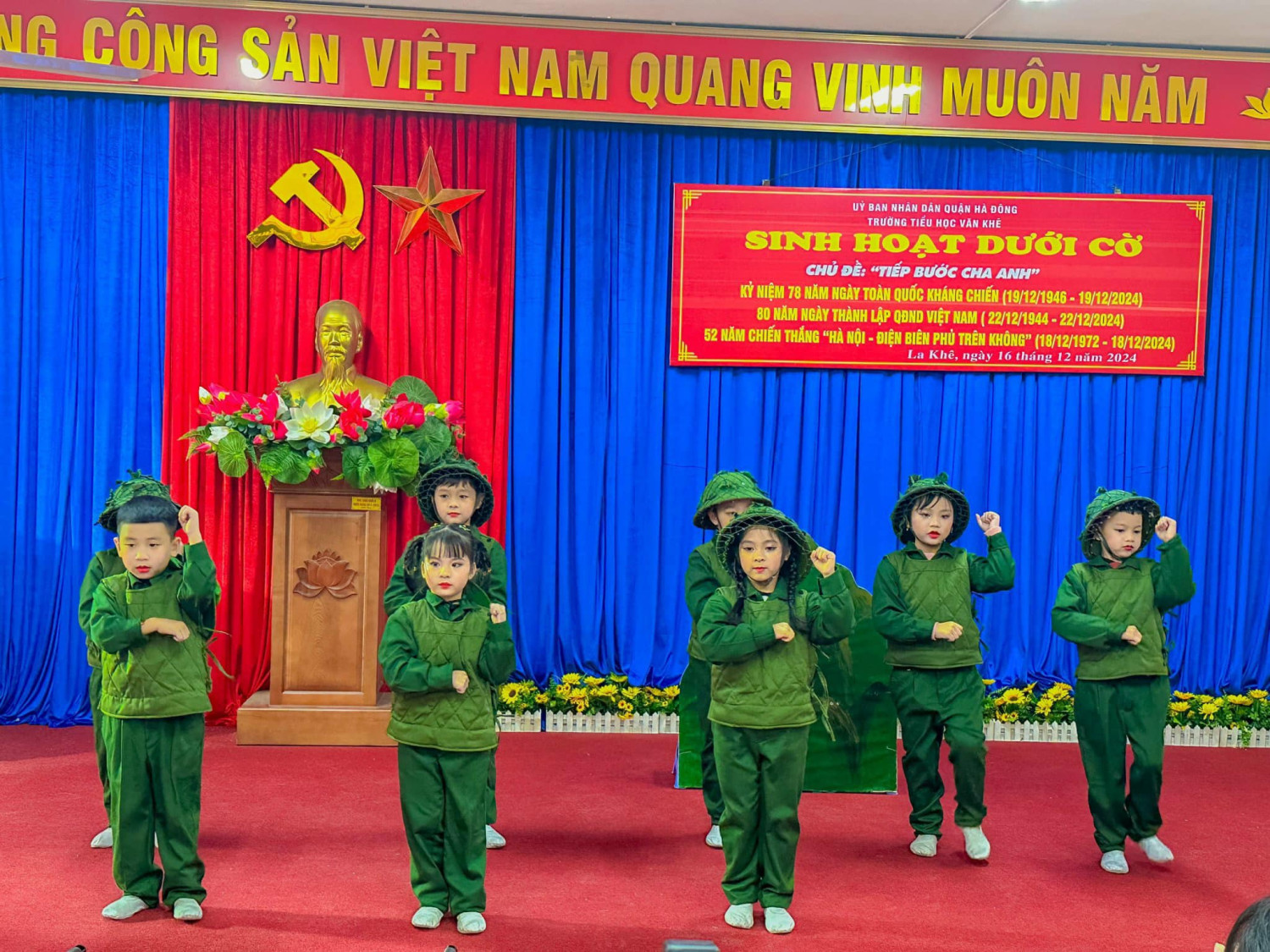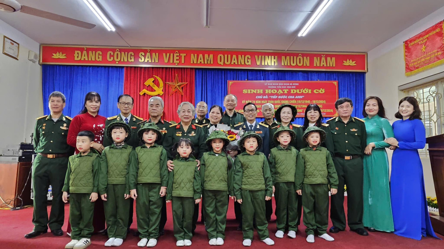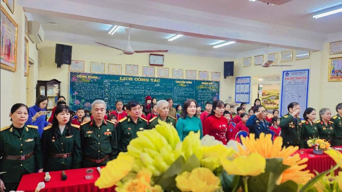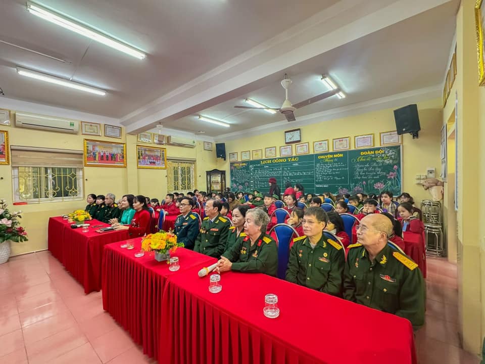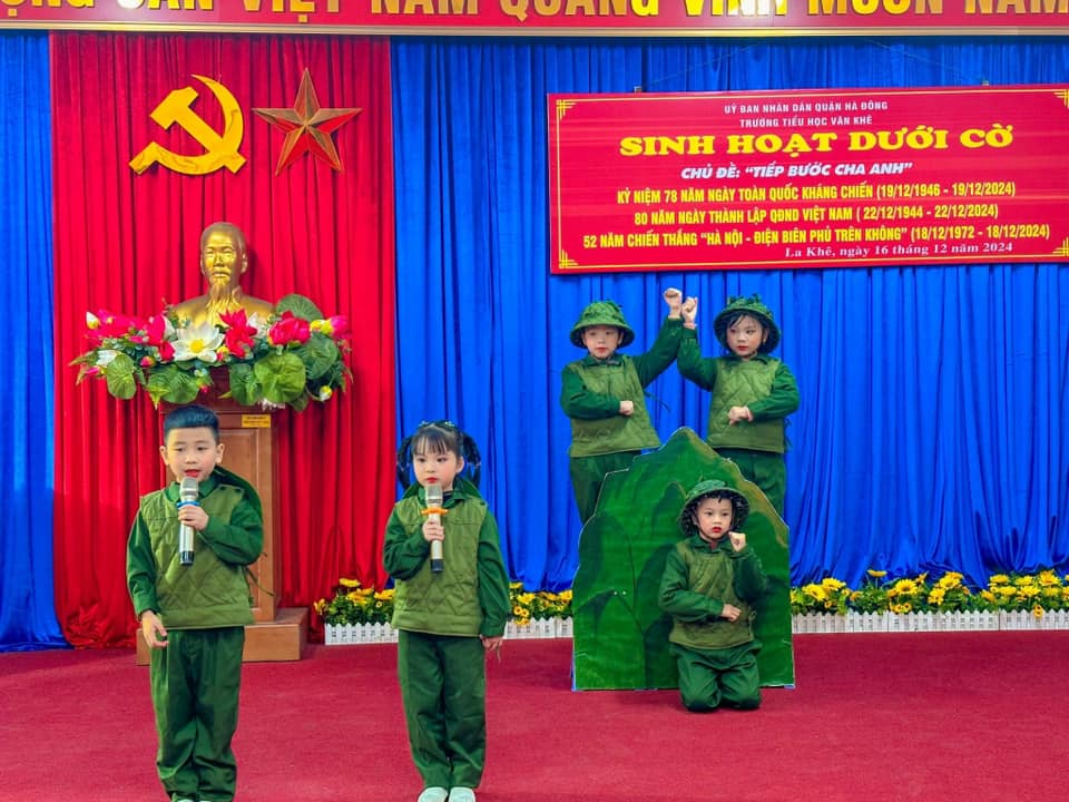Sáng nay thứ Hai ngày 16/12/2024, Trường Tiểu học Văn Khê trang trọng tổ chức Lễ kỷ niệm 80 NĂM NGÀY THÀNH LẬP QĐND VIỆT NAM - 35 NĂM NGÀY HỘI QUỐC PHÒNG TOÀN DÂN Tại buổi lễ, thầy trò nhà trường vô cùng vinh dự được đón ông Vũ Xuân Kỷ - Chủ tịch Hội CCB phường La Khê, ông Nguyễn Viết Hằng nguyên Chủ tịch hội CCB và các ông bà trong Đội văn nghệ hội CCB phường về nói chuyện và biểu diễn văn nghệ. Qua buổi lễ nhà trường muốn gửi gắm đến toàn thể thầy cô và các em học sinh ý nghĩa của ngày Thành lập Quân đội nhân dân Việt Nam: Ngày 22/12 hằng năm đã trở thành ngày hội lớn của những người lính và cũng là niềm tự hào của cả dân tộc. Đây là dịp để chúng ta không chỉ tri ân quá khứ mà còn khơi dậy tình yêu nước, lòng biết ơn và ý chí xây dựng đất nước trong mỗi con người Việt Nam. Quân đội Nhân dân Việt Nam, từ khi thành lập đến nay, đã trải qua nhiều giai đoạn lịch sử quan trọng. Từ những ngày đầu gian khó với chỉ 34 chiến sĩ, quân đội ta đã không ngừng lớn mạnh và trưởng thành qua các cuộc kháng chiến chống Pháp, chống Mỹ và bảo vệ biên giới. Mỗi giai đoạn lịch sử đều ghi dấu những chiến công oanh liệt và sự hy sinh to lớn của các chiến sĩ. Nhìn lại hành trình 80 năm qua, chúng ta không khỏi xúc động khi nghĩ về hình ảnh những người lính "Bộ đội Cụ Hồ" – giản dị, kiên cường nhưng tràn đầy lý tưởng cao đẹp. Họ đã đi qua những năm tháng gian khổ nhất, đặt mạng sống của mình lên tuyến đầu để bảo vệ Tổ quốc. Họ không chỉ chiến đấu vì độc lập, tự do, mà còn vì hạnh phúc của từng mái nhà, vì giấc mơ hòa bình của thế hệ mai sau. Có những người lính đã nằm xuống khi tuổi đời còn rất trẻ, để lại phía sau những lá thư chưa kịp gửi, những lời hứa chưa kịp thực hiện. Có những người mẹ, người vợ tiễn chồng, con ra đi mà không biết rằng, đó là lần cuối cùng được nhìn thấy nhau. Đây là những hy sinh lặng thầm, nhưng vĩ đại, đã viết nên trang sử vàng chói lọi cho dân tộc Việt Nam. Hôm nay, chúng ta được sống trong một đất nước hòa bình, các em học sinh có thể vui đùa trong tiếng cười hồn nhiên, thầy trò có thể xây dựng tương lai mà không còn lo sợ tiếng bom đạn. Nhưng đằng sau sự yên bình ấy là biết bao máu xương đã đổ, biết bao giấc mơ đã dừng lại mãi mãi nơi chiến trường khốc liệt.! Cho đến bây giờ, khi chiến tranh đã lùi xa, nhưng Quân đội Nhân dân Việt Nam không chỉ là đội quân chiến đấu mà còn là đội quân xây dựng, đội quân của lòng nhân ái. Hình ảnh người chiến sỹ luôn hiện diện như một biểu tượng của sự cống hiến và hy sinh. Họ có mặt ở những vùng sâu, vùng xa, nơi biên cương hay hải đảo xa xôi để bảo vệ từng dải đất, từng ngọn sóng thiêng liêng của Tổ quốc. Nhân dịp kỷ niệm 80 năm ngày thành lập Quân đội Nhân dân Việt Nam, Thầy trò Trường Tiểu học Văn Khê đã cùng nhau tri ân và tôn vinh những chiến sỹ đã và đang cống hiến cho đất nước. Với cương vị là người đứng đầu trong nhà trường cô giáo Trần Thị Quyên -Bí thư chi bộ - Hiệu trưởng nhà trường kêu gọi toàn thể CB, GV, VN cùng các em HS không ngừng phấn đấu, học tập, rèn luyện để chúng ta cùng nhau giữ gìn và phát huy truyền thống vẻ vang của Quân đội Nhân dân Việt Nam, xây dựng một đất nước Việt Nam hòa bình, thịnh vượng và phát triển. Quyết tâm học tập, rèn luyện để cùng đất nước bước vào kỷ nguyên mới - KỶ NGUYÊN VƯƠN MÌNH CỦA DÂN TỘC!