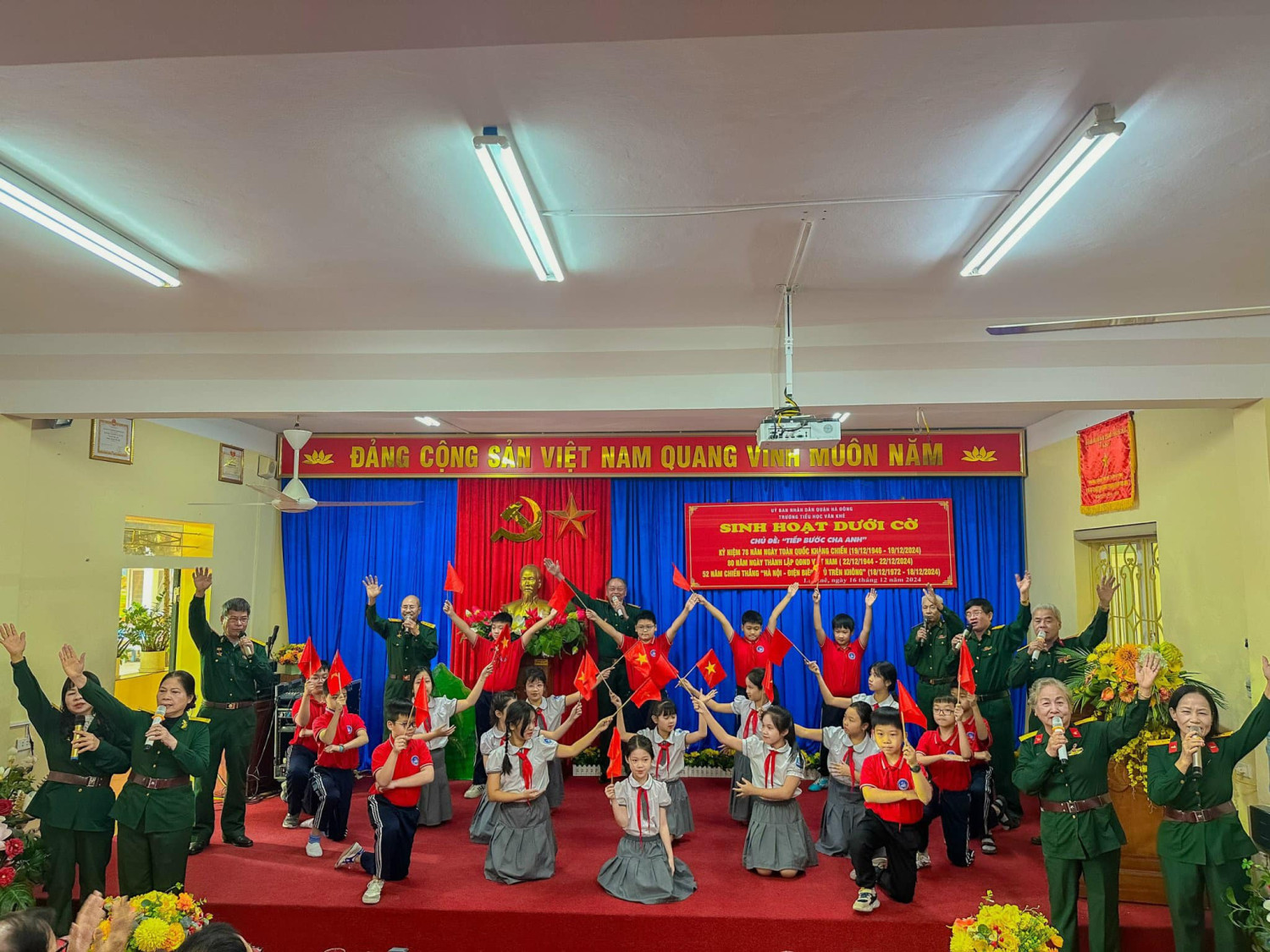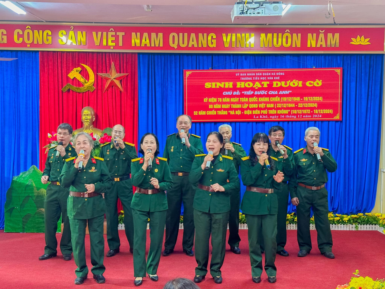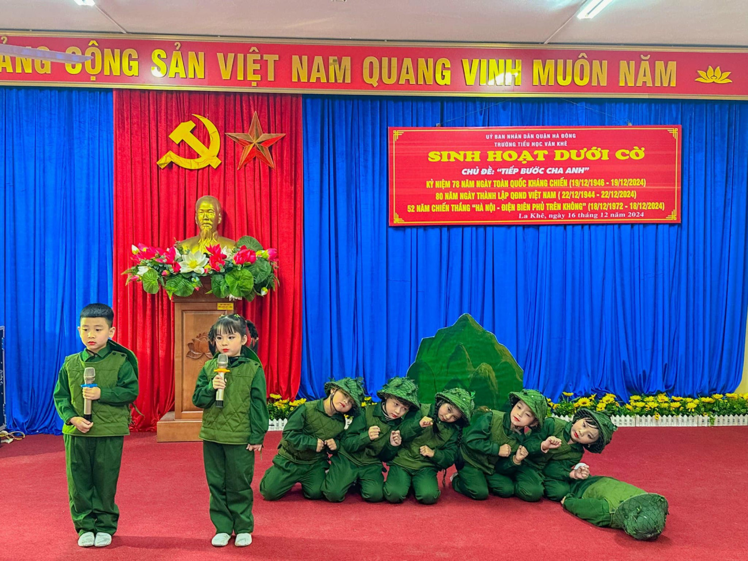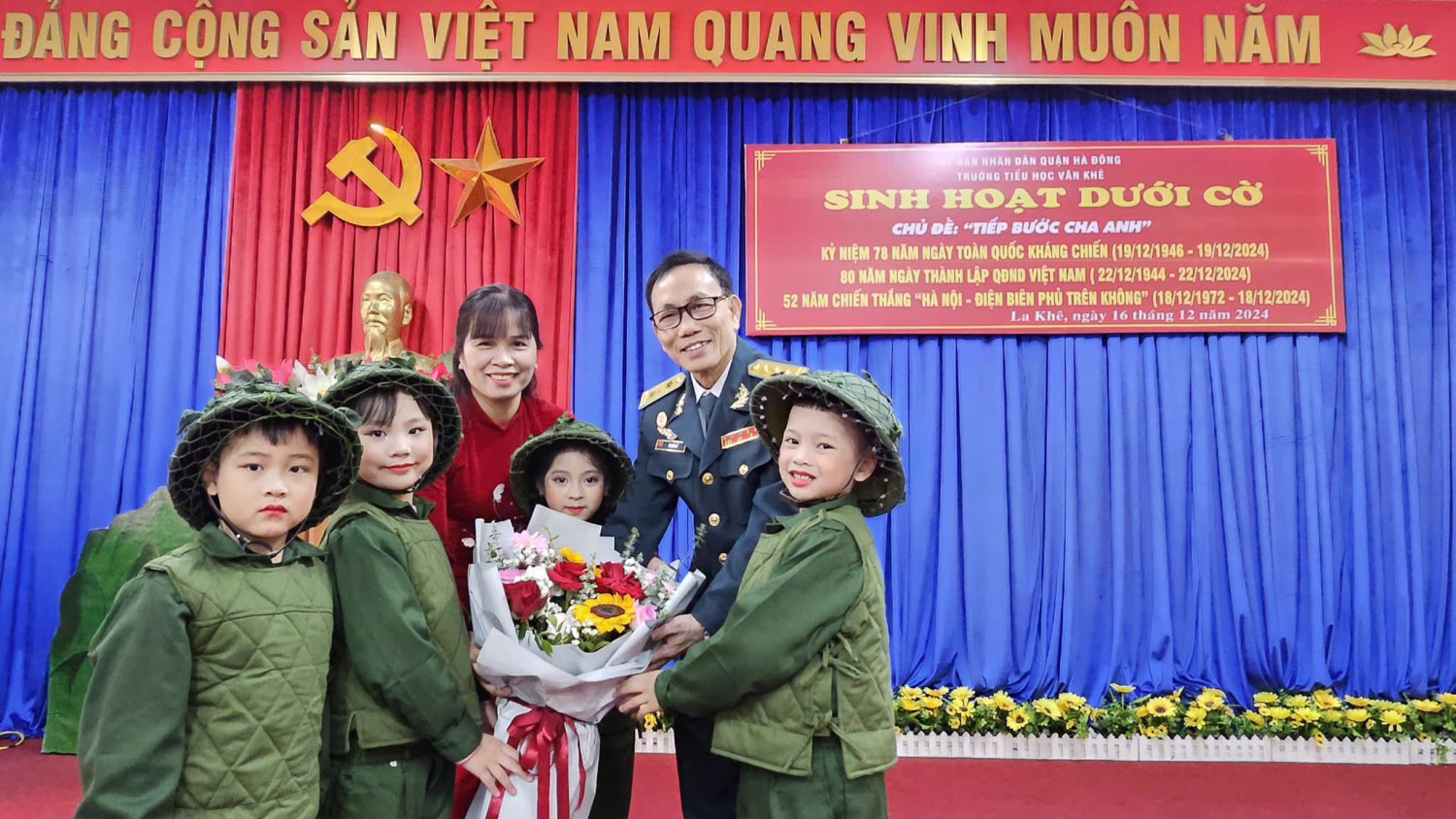 Sáng nay thứ Hai ngày 16/12/2024, Trường Tiểu học Văn Khê trang trọng tổ chức Lễ kỷ niệm 80 NĂM NGÀY THÀNH LẬP QĐND VIỆT NAM - 35 NĂM NGÀY HỘI QUỐC PHÒNG TOÀN DÂN Tại buổi lễ, thầy trò nhà trường vô cùng vinh dự được đón ông Vũ Xuân Kỷ - Chủ tịch Hội CCB phường La Khê, ông Nguyễn Viết Hằng nguyên Chủ tịch hội CCB và các ông bà trong Đội văn nghệ hội CCB phường về nói chuyện và biểu diễn văn nghệ. Qua buổi lễ nhà trường muốn gửi gắm đến toàn thể thầy cô và các em học sinh ý nghĩa của ngày Thành lập Quân đội nhân dân Việt Nam: Ngày 22/12 hằng năm đã trở thành ngày hội lớn của những người lính và cũng là niềm tự hào của cả dân tộc. Đây là dịp để chúng ta không chỉ tri ân quá khứ mà còn khơi dậy tình yêu nước, lòng biết ơn và ý chí xây dựng đất nước trong mỗi con người Việt Nam. Quân đội Nhân dân Việt Nam, từ khi thành lập đến nay, đã trải qua nhiều giai đoạn lịch sử quan trọng. Từ những ngày đầu gian khó với chỉ 34 chiến sĩ, quân đội ta đã không ngừng lớn mạnh và trưởng thành qua các cuộc kháng chiến chống Pháp, chống Mỹ và bảo vệ biên giới. Mỗi giai đoạn lịch sử đều ghi dấu những chiến công oanh liệt và sự hy sinh to lớn của các chiến sĩ. Nhìn lại hành trình 80 năm qua, chúng ta không khỏi xúc động khi nghĩ về hình ảnh những người lính "Bộ đội Cụ Hồ" – giản dị, kiên cường nhưng tràn đầy lý tưởng cao đẹp. Họ đã đi qua những năm tháng gian khổ nhất, đặt mạng sống của mình lên tuyến đầu để bảo vệ Tổ quốc. Họ không chỉ chiến đấu vì độc lập, tự do, mà còn vì hạnh phúc của từng mái nhà, vì giấc mơ hòa bình của thế hệ mai sau. Có những người lính đã nằm xuống khi tuổi đời còn rất trẻ, để lại phía sau những lá thư chưa kịp gửi, những lời hứa chưa kịp thực hiện. Có những người mẹ, người vợ tiễn chồng, con ra đi mà không biết rằng, đó là lần cuối cùng được nhìn thấy nhau. Đây là những hy sinh lặng thầm, nhưng vĩ đại, đã viết nên trang sử vàng chói lọi cho dân tộc Việt Nam. Hôm nay, chúng ta được sống trong một đất nước hòa bình, các em học sinh có thể vui đùa trong tiếng cười hồn nhiên, thầy trò có thể xây dựng tương lai mà không còn lo sợ tiếng bom đạn. Nhưng đằng sau sự yên bình ấy là biết bao máu xương đã đổ, biết bao giấc mơ đã dừng lại mãi mãi nơi chiến trường khốc liệt.! Cho đến bây giờ, khi chiến tranh đã lùi xa, nhưng Quân đội Nhân dân Việt Nam không chỉ là đội quân chiến đấu mà còn là đội quân xây dựng, đội quân của lòng nhân ái. Hình ảnh người chiến sỹ luôn hiện diện như một biểu tượng của sự cống hiến và hy sinh. Họ có mặt ở những vùng sâu, vùng xa, nơi biên cương hay hải đảo xa xôi để bảo vệ từng dải đất, từng ngọn sóng thiêng liêng của Tổ quốc. Nhân dịp kỷ niệm 80 năm ngày thành lập Quân đội Nhân dân Việt Nam, Thầy trò Trường Tiểu học Văn Khê đã cùng nhau tri ân và tôn vinh những chiến sỹ đã và đang cống hiến cho đất nước. Với cương vị là người đứng đầu trong nhà trường cô giáo Trần Thị Quyên -Bí thư chi bộ - Hiệu trưởng nhà trường kêu gọi toàn thể CB, GV, VN cùng các em HS không ngừng phấn đấu, học tập, rèn luyện để chúng ta cùng nhau giữ gìn và phát huy truyền thống vẻ vang của Quân đội Nhân dân Việt Nam, xây dựng một đất nước Việt Nam hòa bình, thịnh vượng và phát triển. Quyết tâm học tập, rèn luyện để cùng đất nước bước vào kỷ nguyên mới - KỶ NGUYÊN VƯƠN MÌNH CỦA DÂN TỘC!
