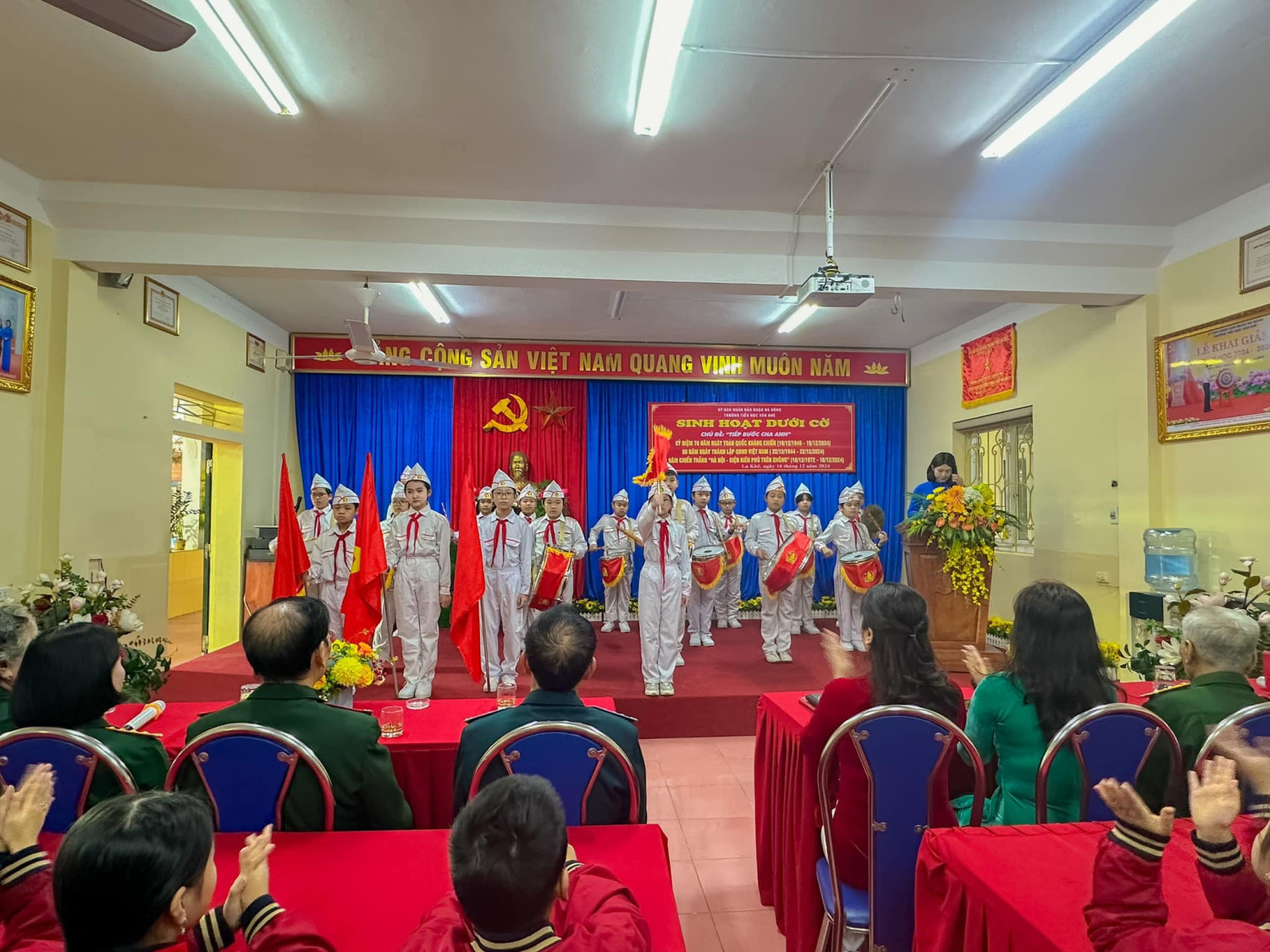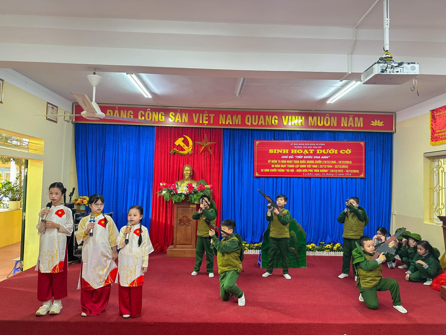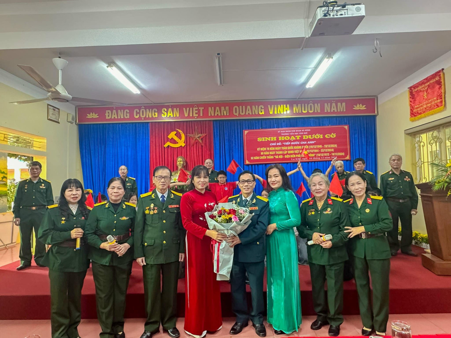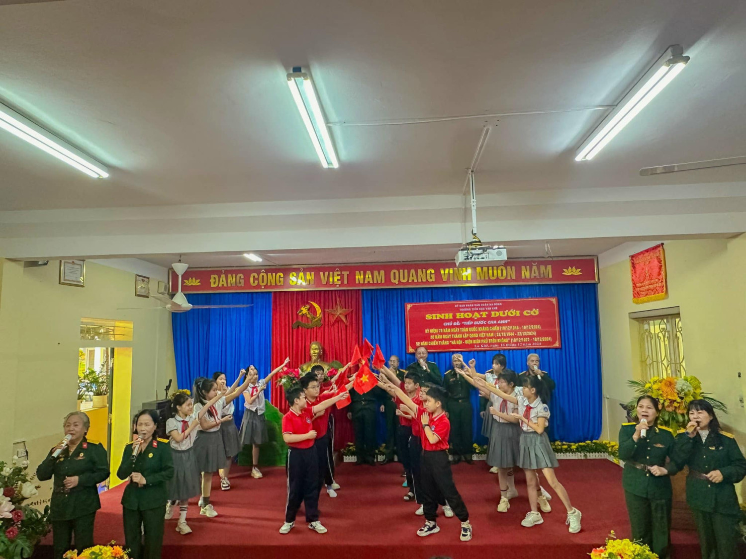 Sáng nay thứ Hai ngày 16/12/2024, Trường Tiểu học Văn Khê trang trọng tổ chức Lễ kỷ niệm 80 NĂM NGÀY THÀNH LẬP QĐND VIỆT NAM - 35 NĂM NGÀY HỘI QUỐC PHÒNG TOÀN DÂN Tại buổi lễ, thầy trò nhà trường vô cùng vinh dự được đón ông Vũ Xuân Kỷ - Chủ tịch Hội CCB phường La Khê, ông Nguyễn Viết Hằng nguyên Chủ tịch hội CCB và các ông bà trong Đội văn nghệ hội CCB phường về nói chuyện và biểu diễn văn nghệ. Qua buổi lễ nhà trường muốn gửi gắm đến toàn thể thầy cô và các em học sinh ý nghĩa của ngày Thành lập Quân đội nhân dân Việt Nam: Ngày 22/12 hằng năm đã trở thành ngày hội lớn của những người lính và cũng là niềm tự hào của cả dân tộc. Đây là dịp để chúng ta không chỉ tri ân quá khứ mà còn khơi dậy tình yêu nước, lòng biết ơn và ý chí xây dựng đất nước trong mỗi con người Việt Nam. Quân đội Nhân dân Việt Nam, từ khi thành lập đến nay, đã trải qua nhiều giai đoạn lịch sử quan trọng. Từ những ngày đầu gian khó với chỉ 34 chiến sĩ, quân đội ta đã không ngừng lớn mạnh và trưởng thành qua các cuộc kháng chiến chống Pháp, chống Mỹ và bảo vệ biên giới. Mỗi giai đoạn lịch sử đều ghi dấu những chiến công oanh liệt và sự hy sinh to lớn của các chiến sĩ. Nhìn lại hành trình 80 năm qua, chúng ta không khỏi xúc động khi nghĩ về hình ảnh những người lính "Bộ đội Cụ Hồ" – giản dị, kiên cường nhưng tràn đầy lý tưởng cao đẹp. Họ đã đi qua những năm tháng gian khổ nhất, đặt mạng sống của mình lên tuyến đầu để bảo vệ Tổ quốc. Họ không chỉ chiến đấu vì độc lập, tự do, mà còn vì hạnh phúc của từng mái nhà, vì giấc mơ hòa bình của thế hệ mai sau. Có những người lính đã nằm xuống khi tuổi đời còn rất trẻ, để lại phía sau những lá thư chưa kịp gửi, những lời hứa chưa kịp thực hiện. Có những người mẹ, người vợ tiễn chồng, con ra đi mà không biết rằng, đó là lần cuối cùng được nhìn thấy nhau. Đây là những hy sinh lặng thầm, nhưng vĩ đại, đã viết nên trang sử vàng chói lọi cho dân tộc Việt Nam. Hôm nay, chúng ta được sống trong một đất nước hòa bình, các em học sinh có thể vui đùa trong tiếng cười hồn nhiên, thầy trò có thể xây dựng tương lai mà không còn lo sợ tiếng bom đạn. Nhưng đằng sau sự yên bình ấy là biết bao máu xương đã đổ, biết bao giấc mơ đã dừng lại mãi mãi nơi chiến trường khốc liệt.! Cho đến bây giờ, khi chiến tranh đã lùi xa, nhưng Quân đội Nhân dân Việt Nam không chỉ là đội quân chiến đấu mà còn là đội quân xây dựng, đội quân của lòng nhân ái. Hình ảnh người chiến sỹ luôn hiện diện như một biểu tượng của sự cống hiến và hy sinh. Họ có mặt ở những vùng sâu, vùng xa, nơi biên cương hay hải đảo xa xôi để bảo vệ từng dải đất, từng ngọn sóng thiêng liêng của Tổ quốc. Nhân dịp kỷ niệm 80 năm ngày thành lập Quân đội Nhân dân Việt Nam, Thầy trò Trường Tiểu học Văn Khê đã cùng nhau tri ân và tôn vinh những chiến sỹ đã và đang cống hiến cho đất nước. Với cương vị là người đứng đầu trong nhà trường cô giáo Trần Thị Quyên -Bí thư chi bộ - Hiệu trưởng nhà trường kêu gọi toàn thể CB, GV, VN cùng các em HS không ngừng phấn đấu, học tập, rèn luyện để chúng ta cùng nhau giữ gìn và phát huy truyền thống vẻ vang của Quân đội Nhân dân Việt Nam, xây dựng một đất nước Việt Nam hòa bình, thịnh vượng và phát triển. Quyết tâm học tập, rèn luyện để cùng đất nước bước vào kỷ nguyên mới - KỶ NGUYÊN VƯƠN MÌNH CỦA DÂN TỘC!