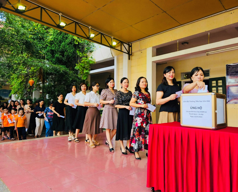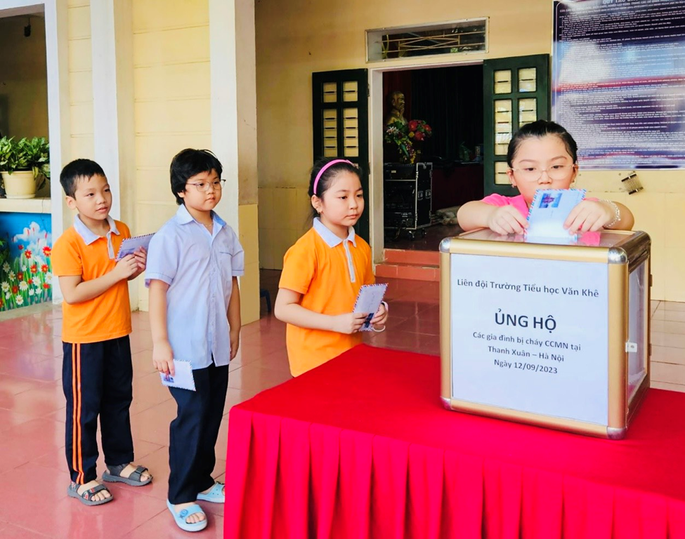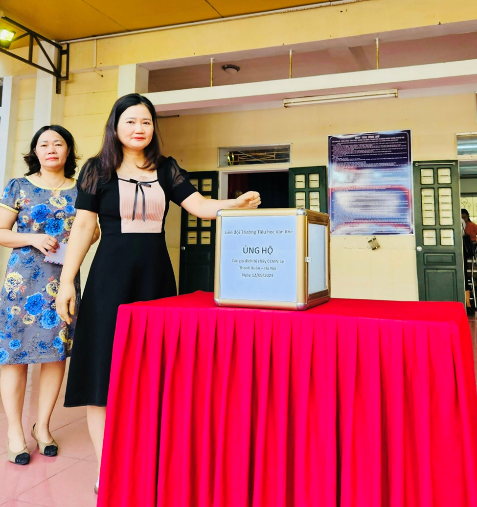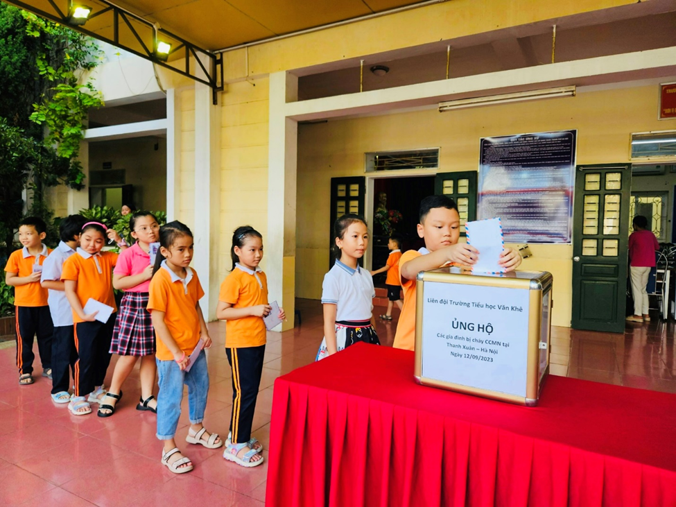 Sáng ngày 15/9/2023, sau khi Liên đội trường Tiểu học Văn Khê làm lễ chào cờ đầu tuần. Toàn trường dành 1 phút mặc niệm các nạn nhân trong vụ hỏa hoạn cháy chung cư mini đêm 12/9 tại phường Khương Đình, quận Thanh Xuân, Hà Nội. Với tinh thần tương thân tương ái, công đoàn và liên đội nhà trường phát động tới toàn thể cán bộ, giáo viên nhân viên và học sinh ủng hộ các gia đình bị thiệt hại về người và của trong vụ hỏa hoạn. Tấm lòng yêu thương, sự sẻ chia của thầy và trò nhà trường phần nào động viên các gia đình gặp nạn làm vơi bớt nỗi nhọc nhằn về vật chất nhưng vết thương lòng thì vẫn còn đâu đó nỗi ám ảnh, sự xót xa của bao con người..... Tương lai của các em sinh viên, các bạn học sinh, các em nhỏ đang rộng mở … Họ là niềm tự hào của bao gia đình và dòng họ..thế mà chỉ qua một đêm cánh cửa tương lai đã khép lại. Chỉ để lại sự chia ly, đau đớn đến tột độ. Thầy và trò trường Tiểu học Văn Khê xin gửi lời chia buồn tới các nạn nhân. Kết thúc buổi lễ cô giáo Đinh Thị Ngọc Lan – Phó hiệu trưởng nhà trường lên căn dặn học sinh về kỹ năng PCCC và an toàn khi tham gia giao thông. Chúc thầy và trò nhà trường luôn được mạnh khỏe, bình an. Sau đây là một số hình ảnh của buổi sinh hoạt: