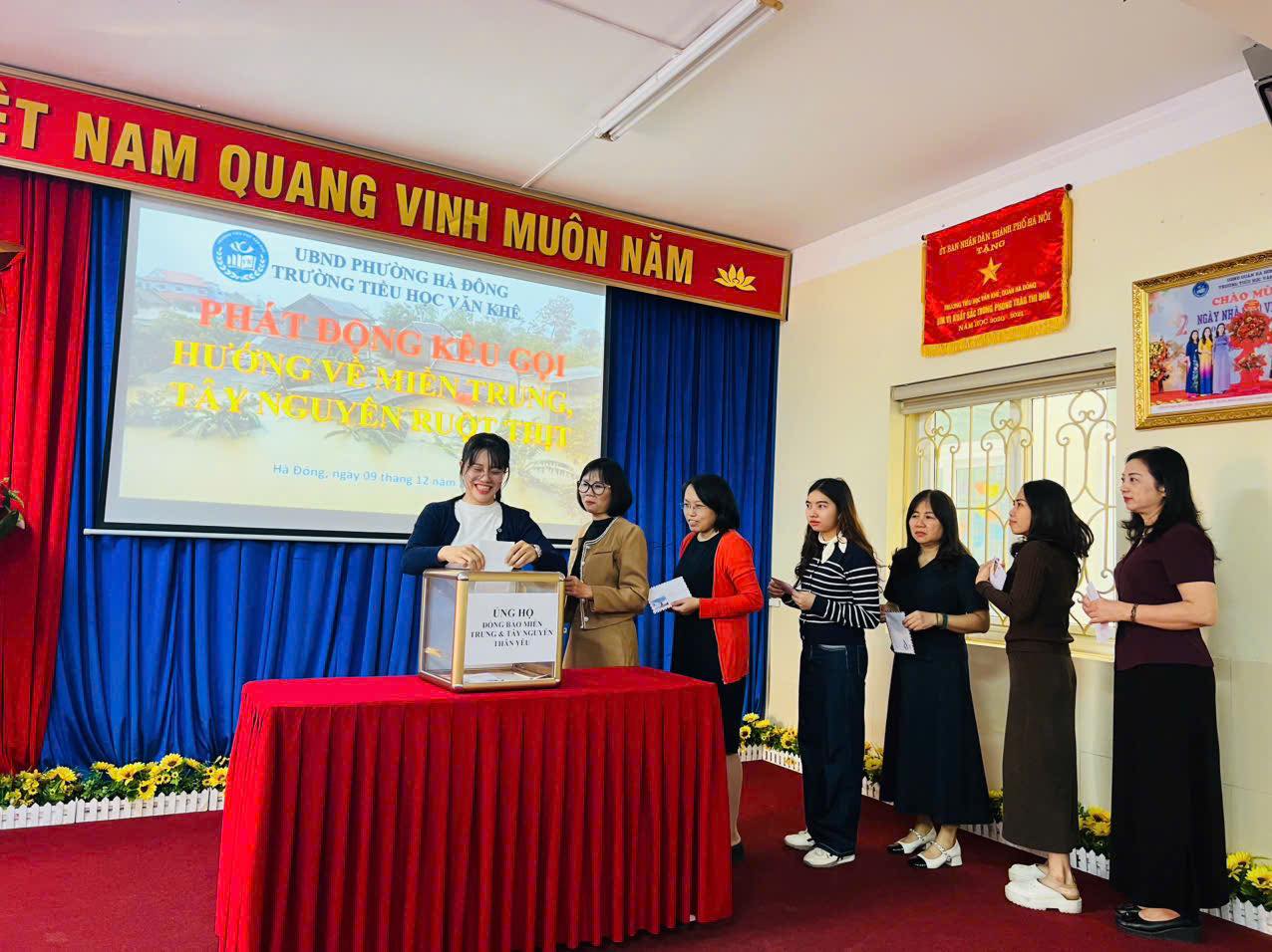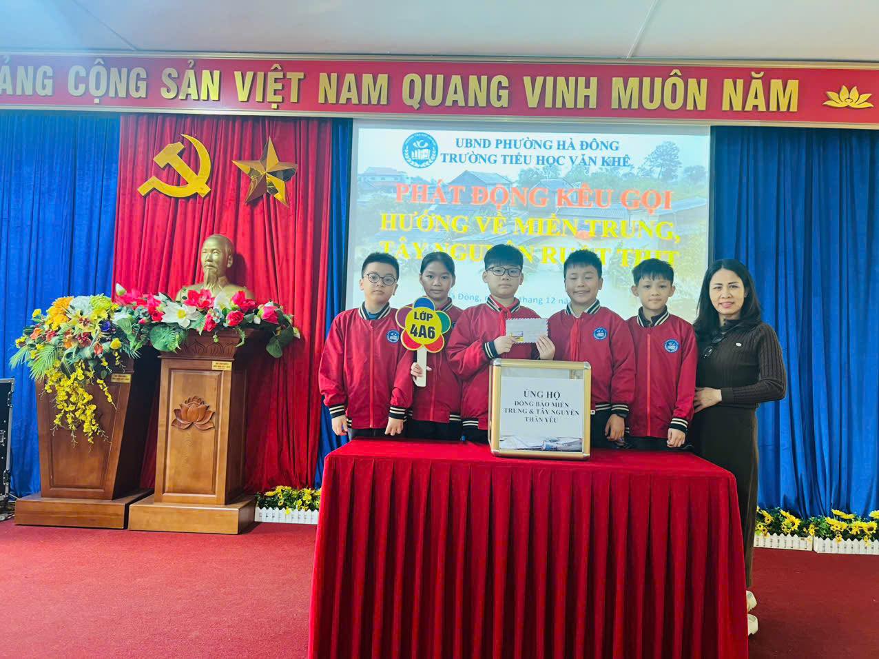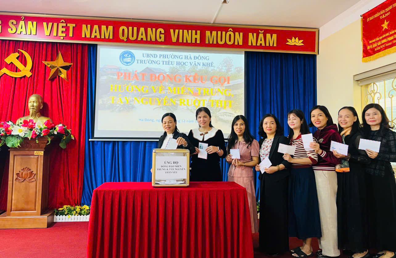 Trước những thiệt hại nặng nề do thiên tai gây ra tại các tỉnh miền Trung – Tây Nguyên, tập thể cán bộ, giáo viên, nhân viên, phụ huynh và học sinh nhà trường đã phát huy truyền thống nhân ái, tinh thần đoàn kết, chung tay hưởng ứng chương trình “Ủng hộ lũ lụt – Hướng về miền Trung, Tây Nguyên thân yêu” với tất cả tấm lòng sẻ chia và trách nhiệm cộng đồng. Trong 5 ngày từ ngày 05/12 đến hết ngày 10/12 kết quả: 1. Ủng hộ đồng bào miền Trung – Tây Nguyên bị lũ lụt do PH và các con HS toàn trường được: 101.972.000 đồng Trong đó: 13.850.000 đồng phụ huynh chuyển khoản trực tiếp tới Ủy ban Mặt trận Tổ quốc phường Hà Đông. 88.122.000 đồng qua cô giáo chủ nhiệm lớp. Cô Lê Thị Phi Nga – Tổng phụ trách Đội và cô Dương Thị Vân thay mặt nhà trường trao trực tiếp tới đồng chí Nguyễn Đức Chí – Phó Chủ tịch UB MTTQ, Chủ tịch Công đoàn vào chiều ngày 10/12. Đây là tình cảm chân thành, xuất phát từ tấm lòng vàng của Quý vị phụ huynh và các em học sinh. Tình cảm của Quý PH sẽ phần nào giúp đồng bào vùng thiên tai sớm khắc phục khó khăn, ổn định cuộc sống.