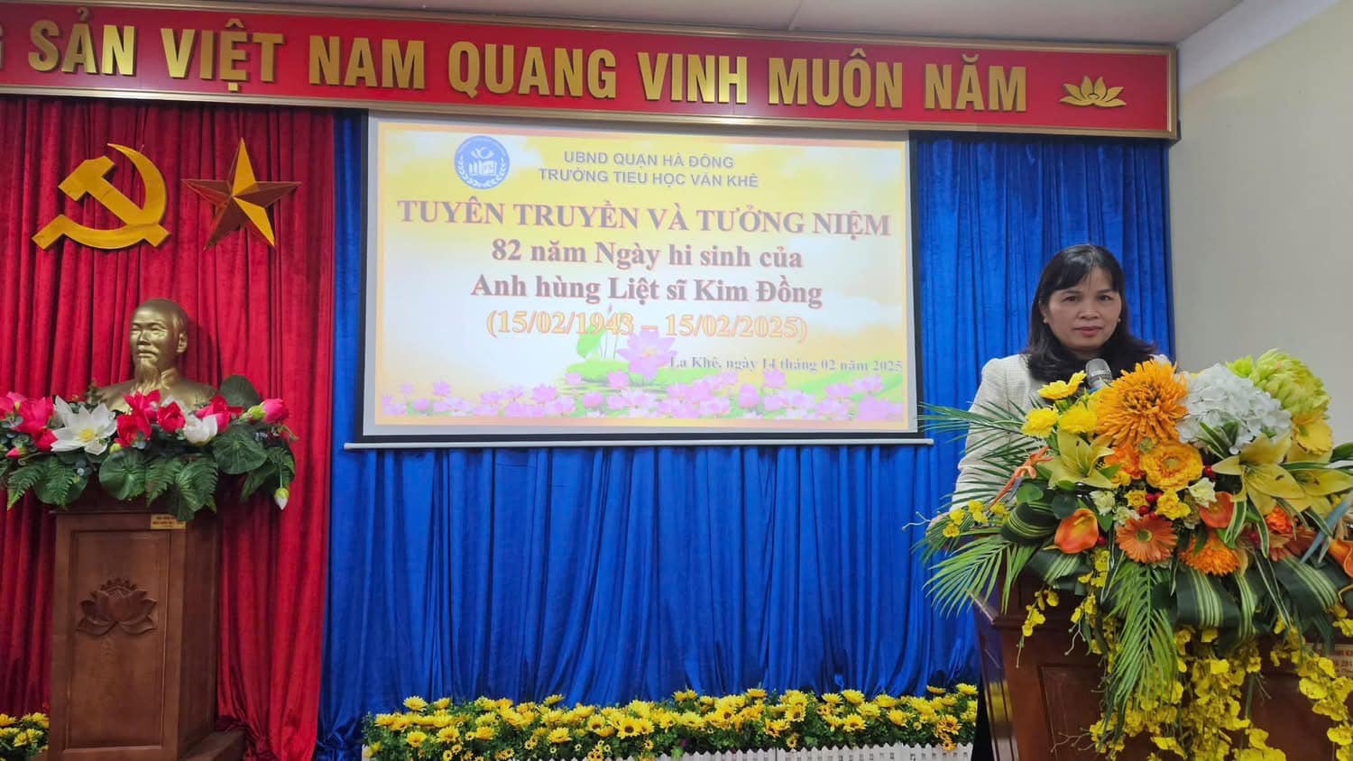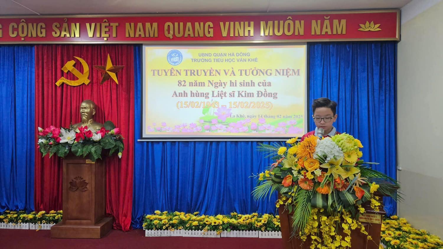 Nhân kỷ niệm 82 năm ngày hy sinh của anh hùng liệt sĩ Kim Đồng (15/2/1943 – 15/2/2025), sáng nay ngày 14/2/2025 Liên đội Trường Tiểu học Văn Khê tổ chức sinh hoạt "Tuyên truyền và tưởng niệm tấm gương Anh hùng Liệt sĩ Kim Đồng" Qua buổi sinh hoạt giới thiệu các em học sinh có thêm hiểu biết về tiểu sử của Anh hùng liệt sĩ Kim Đồng (Nông Văn Dền) - Người Đội trưởng đầu tiên của Đội nhi đồng cứu quốc. Với lòng gan dạ, dũng cảm, tấm gương hy sinh anh dũng của Kim Đồng đã được ghi vào lịch sử của Đội Thiếu niên tiền phong Hồ Chí Minh, trở thành một trong những anh hùng nhỏ tuổi của dân tộc. Trước đó trong tháng 12 với chủ đề TIẾP BƯỚC CHA ANH, cô giáo Trần Thị Quyên - Bí thư chi bộ - Hiệu trưởng nhà trường đọc toàn bộ cuốn truyện KIM ĐỒNG cho các em học sinh nghe trước giờ ngủ trưa từ thứ Hai đến thứ Sáu hằng tuần qua hệ thống loa thông phòng của nhà trường. “Hình tượng người anh hùng nhỏ tuổi Kim Đồng mãi mãi khắc sâu trong tâm trí của thiếu nhi Việt Nam và đã trở thành một trong những tấm gương anh hùng tiêu biểu, gần gũi nhất đối với thế hệ trẻ. Tên tuổi anh gắn liền với núi sông, trở thành niềm tự hào, động lực phấn đấu cho lớp lớp thế hệ thiếu niên nhi đồng trên khắp cả nước”- Đó là ý nghĩa mà cô Quyên muốn gửi đến các con học sinh qua câu truyện Kim Đồng cô đã đọc cho các con học sinh nghe. Cũng trong buổi sinh hoạt hôm nay, các em được xem những thước phim 3D về vị anh hùng nhỏ tuổi Kim Đồng. Thông qua đó nhằm giáo dục tinh thần, truyền thống yêu nước từ ngàn đời của dân tộc ta. Dưới đây là một số hình ảnh được ghi nhận