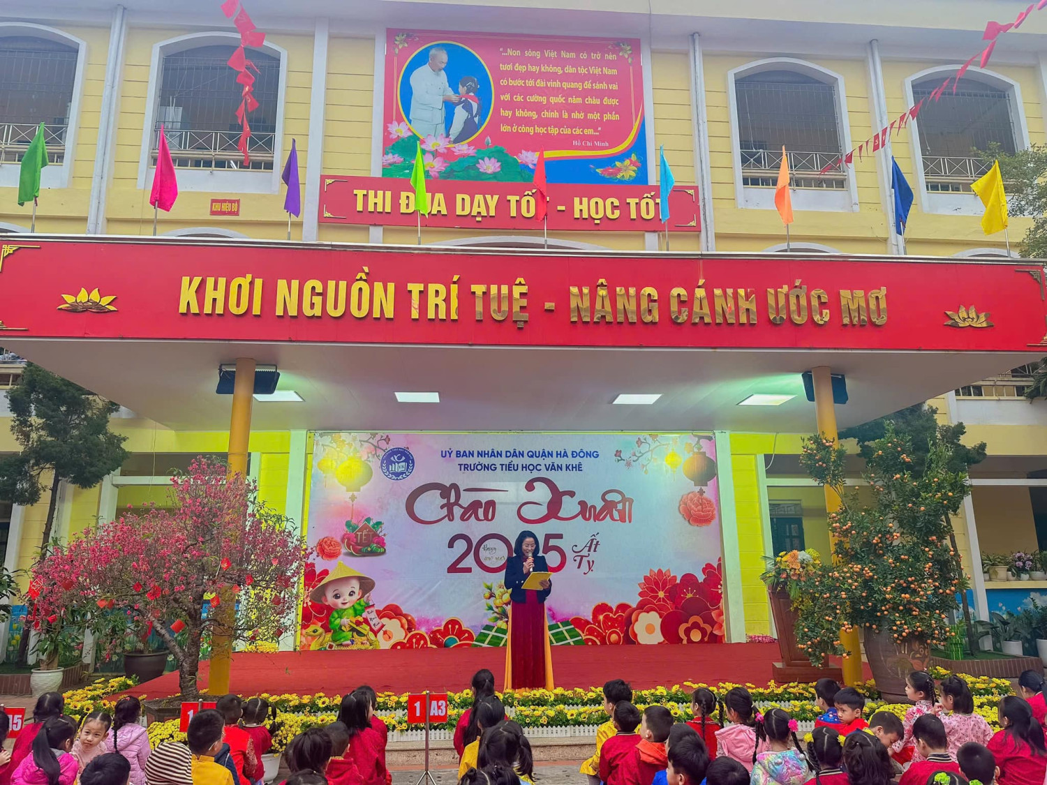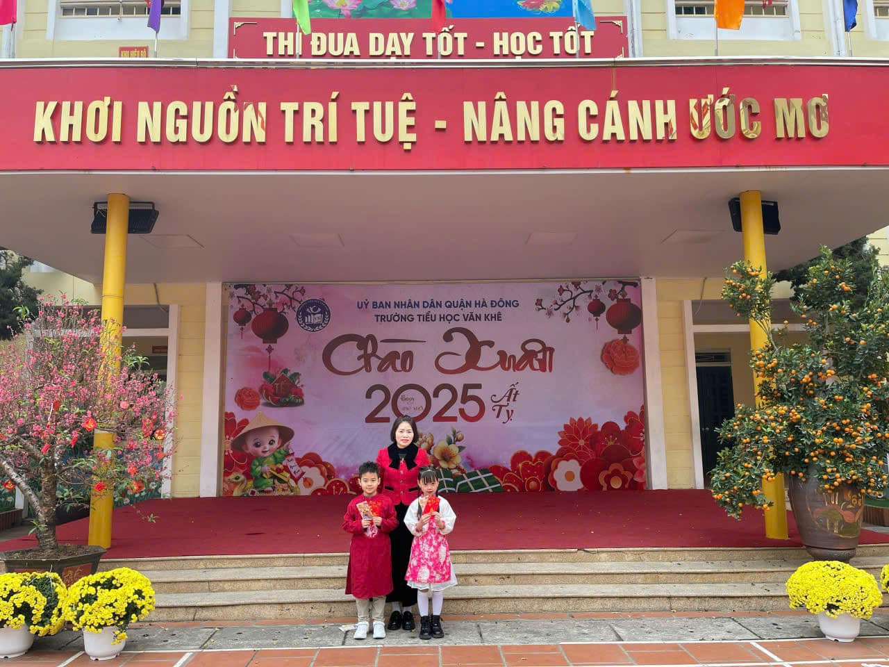 Nắng Xuân Nắng xuân vàng ở khắp nơi. Hoa thơm đua nở, đất trời ngát hương. Gió mơn man thổi dịu dàng. Lòng người phơi phới ngập tràn điều vui. Thực vậy, sáng ngày Mồng 1 Tết Nguyên đán Ất Tỵ 2025, cô giáo Vũ Thị Hồng Thiều cùng các con Phùng Thảo Chi, Lê Minh Đăng lớp 1A4 đại diện cho các em học sinh đến trường XÔNG ĐẤT với mong muốn MAY MẮN cho năm mới. Đồng thời thể hiện ƯỚC VỌNG một năm SUÔN SẺ, MỘT NIỀM TIN VÀO SỰ KHỞI ĐẦU THUẬN LỢI Sáng ngày