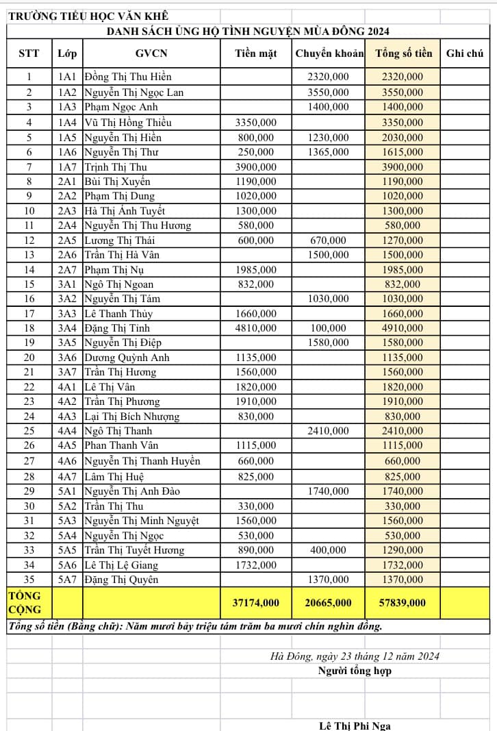 Thực hiện số 37-KH/ĐTN ngày 01/11/2024 của Quân đoàn Hà Đông về chương trình “Tình nguyện mùa đông năm 2024 - Xuân tình nguyện 2025”, kế hoạch số 37-KH/ĐTN của Đoàn phường La Khê ngày 25/11/2024 về chương trình “Tình nguyện mùa đông năm 2024 - Xuân tình nguyện 2025”. Nhằm phát huy tinh thần "Tương thân tương ái"; "Lá lành đùm lá rách" của CBGV và học sinh trường TH Văn Khê. Ban công tác Đội trường TH Văn Khê phát động tới toàn thể cán bộ giáo viên, nhân viên và các em học sinh trong nhà trường tham gia ủng hộ phong trào nhằm giúp đỡ những hoàn cảnh khó khăn trên địa bàn quận Hà Đông và các bạn nhỏ vùng cao huyện Mường Khương - tỉnh Lào Cai. Chương trình được phát động 3 ngày và hôm nay thứ Hai ngày 23/12/2024, hội thu được tiến hành. Và kết quả thật đáng ghi nhận: