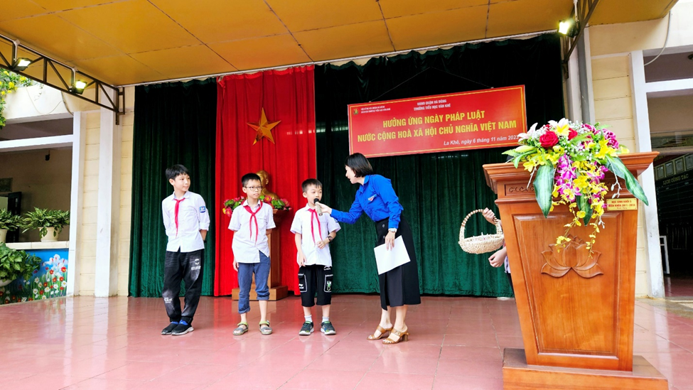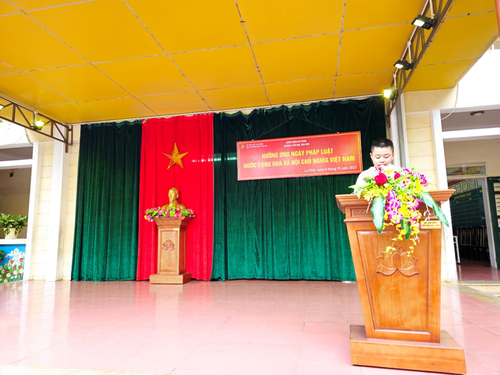 Sáng ngày 03/11, Trường Tiểu học Văn Khê - Quận Hà Đông tổ chức hoạt động Hưởng ứng "Ngày Pháp luật nước Cộng hòa XHCN Việt Nam" năm 2023. Tham dự buổi lễ có sự tham gia của các cô trong Ban giám hiệu, cán bộ giáo viên nhân viên trong nhà trường cùng các em học sinh Trường Tiểu học Văn Khê. Phát biểu hưởng ứng "Ngày Pháp luật nước Cộng hòa XHCN Việt Nam" năm 2023, cô Đinh Thị Ngọc Lan - Phó Hiệu trưởng, Chủ tịch Công đoànnhàtrường cho biết: Trong những năm qua, ngành Giáo dục và Đào tạo quận Hà Đông đã chỉ đạo các đơn vị trường học thực hiện đẩy mạnh tuyên truyền, giáo dục đạo đức, pháp luật cho học sinh trên địa bàn Quận. Theo đó, "Ngày Pháp luật nước Cộng hòa XHCN Việt Nam" hàng năm (9/11) được tổ chức nhằm tôn vinh Hiến pháp, pháp luật, giáo dục ý thức thượng tôn Hiến pháp, pháp luật cho cán bộ, giáo viên, nhân viên và học sinh tại nhà trường, góp phầnnângcao nhận thức tuân thủ pháp luật; xây dựng lối sống và làm việc theo Hiến pháp, pháp luật, tạo lập thói quen tự giác thực hiện, ứng xử của mỗi người, .Qua đó, xây dựng văn hóa tuân thủ pháp luật trong mỗi người dân và toàn xã hội. Trong những năm học qua, nhà trường đã đạt nhiều thành tích cao trong việc thực hiện nhiệm vụ năm học, được các cấp tặng nhiều danh hiệu cao quý. Để đạt được điều đó có sự đóng góp tích cực của các thầy giáo, cô giáo trong hoạt động dạy và học cùng các phong trào thi đua trong nhà trường. Các thầy, cô giáo dìu dắt, dạy dỗ các em học sinh thực hiện tốt Năm điều Bác Hồ dạy, xứng đáng là con ngoan, trò giỏi; đẩy mạnh tuyên truyền, phổ biến giáo dục pháp luật, nâng cao ý thức chấp hành pháp luật cho các em học sinh góp phần nâng cao sự hiểu biết về pháp luật, sống và làm việc theo Hiến pháp và pháp luật. Cùng với đó, Trường Tiểu học Văn Khê chủ động đề ra các giải pháp nhằm nâng cao chất lượng công tác phổ biến, giáo dục pháp luật trong nhà trường thông qua việc lồng ghép vào các môn học chính khóa; các giờ ngoại khóa, cung cấp cho học sinh những kiến thức cơ bản về pháp luật tạo lập ý thức chấp hành pháp luật trong mỗi học sinh của nhà trường. Tại chương trình, ban công tác Đội đã tổ chức Cuộc thi tìm hiểu về pháp luật để trang bị thêm kiến thức, hiểu biết Hiến pháp và pháp luật cho các em học sinh. Thông qua các các tình huống trong thực tế và sự hiểu biết pháp luật, những kiến thức cơ bản, phù hợp với lứa tuổi học sinh.