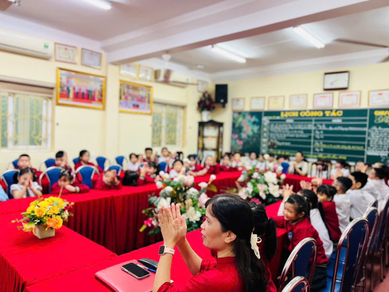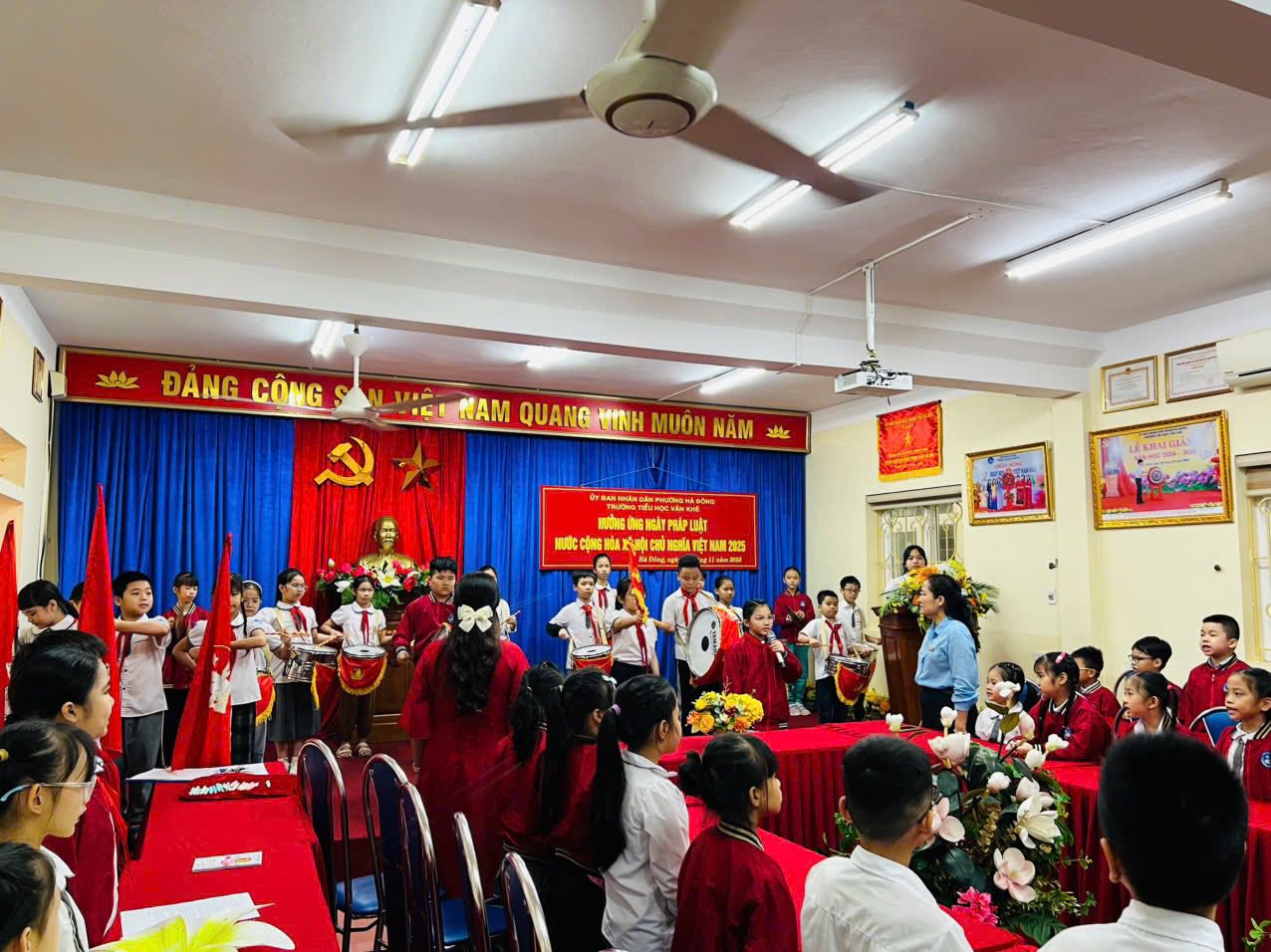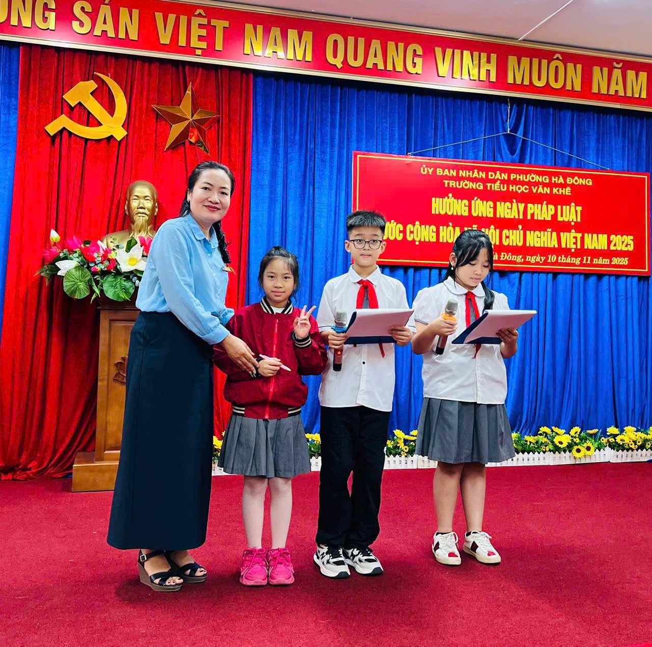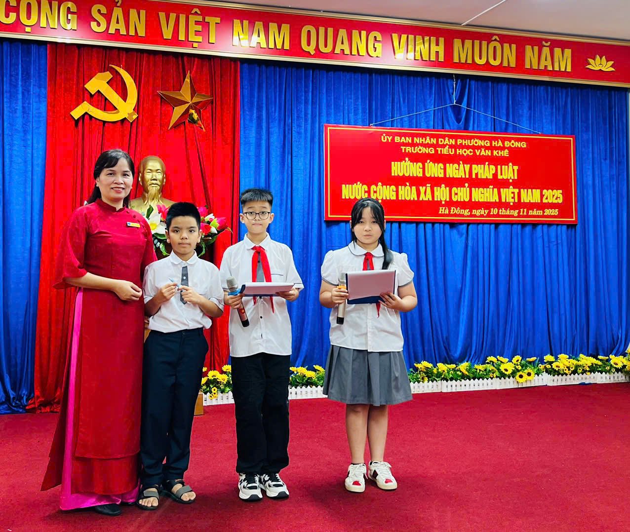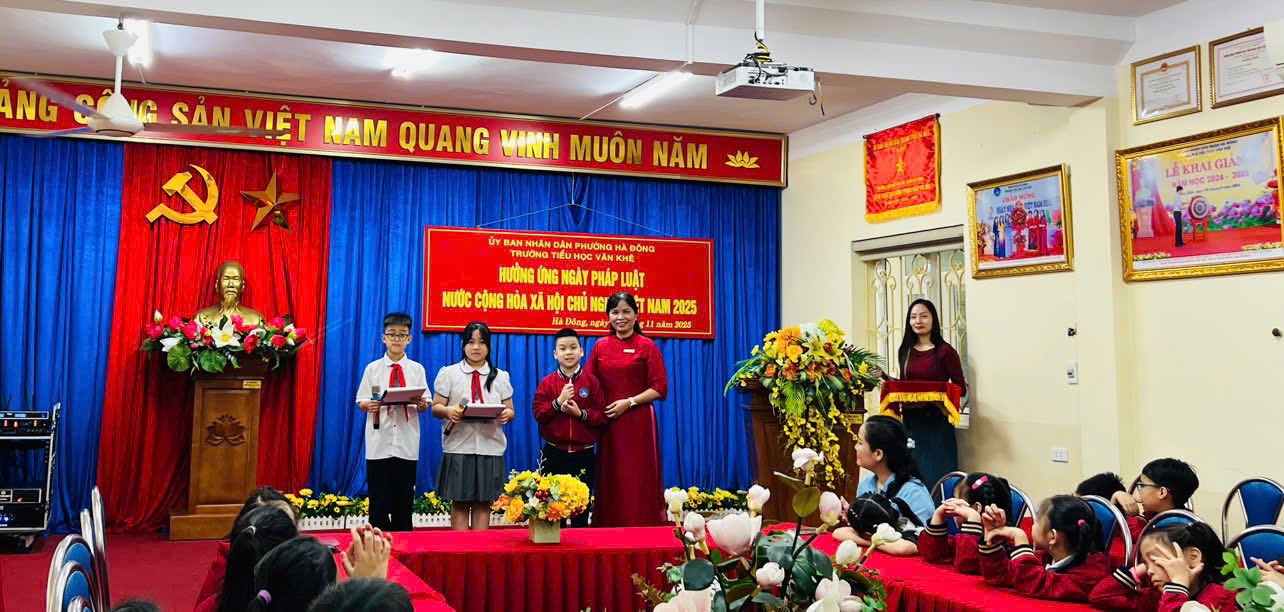 Sáng nay, ngày 10/11/2025, trong không khí tưng bừng hưởng ứng Ngày Pháp luật nước Cộng hòa xã hội chủ nghĩa Việt Nam, thầy và trò trường Tiểu học Văn Khê đã long trọng tổ chức buổi sinh hoạt dưới cờ lồng ghép hoạt động ý nghĩa nhằm tuyên truyền, nâng cao nhận thức về vai trò, vị trí của Hiến pháp và pháp luật trong đời sống cho tập thể CB, GV, NV và các em học sinh. Cũng tại buổi lễ, các em được thưởng thức những tiết mục văn nghệ vô cùng đặc sắc đến từ các em học sinh lớp 3A5; cùng tìm hiểu ý nghĩa của Ngày pháp luật Việt Nam qua phần giao lưu trả lời các câu hỏi và nhận được những phần quà xinh xắn từ Ban giám hiệu. Cuối buổi lễ, cô giáo Trần Thị Quyên - Bí thư Đảng uỷ trường Tiểu học Văn Khê - Hiệu trưởng nhà trường gửi lời chúc tới các em học sinh và khẳng định: "Chúng ta cùng sống, học tập, làm việc trên tinh thần THƯỢNG TÔN HIẾN PHÁP, PHÁP LUẬT."