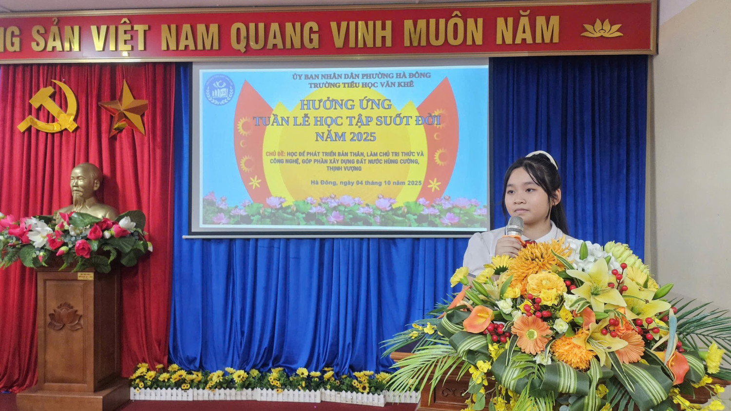 Sáng nay, ngày 04/10/2025, Trường Tiểu học Văn Khê đã long trọng tổ chức Lễ phát động Tuần lễ Học tập suốt đời trong không khí trang nghiêm và đầy phấn khởi. Tuần lễ là dịp để các em hiểu rằng: học tập không chỉ dừng lại ở sách vở, mà còn là hành trình dám ước mơ, dám đặt mục tiêu và kiên trì theo đuổi để trưởng thành mỗi ngày. Trong tuần lễ, các em học sinh không chỉ được tìm hiểu về ý nghĩa, tầm quan trọng của việc học mà còn là dịp để các em thể hiện khả năng giao tiếp tiếng Anh – góp phần nuôi dưỡng sự tự tin, khơi dậy niềm yêu thích ngoại ngữ; mở rộng cánh cửa tri thức toàn cầu. Phấn đấu Tiếng Anh trở thành ngôn ngữ thứ Hai trong trường. Tuần lễ Học tập suốt đời cũng chính là lời nhắc nhở chúng ta rằng: "Tri thức là hành trang quý giá nhất – giúp chúng ta bước và KỈ NGUYÊN VƯƠN MÌNH CỦA DÂN TỘC."