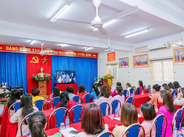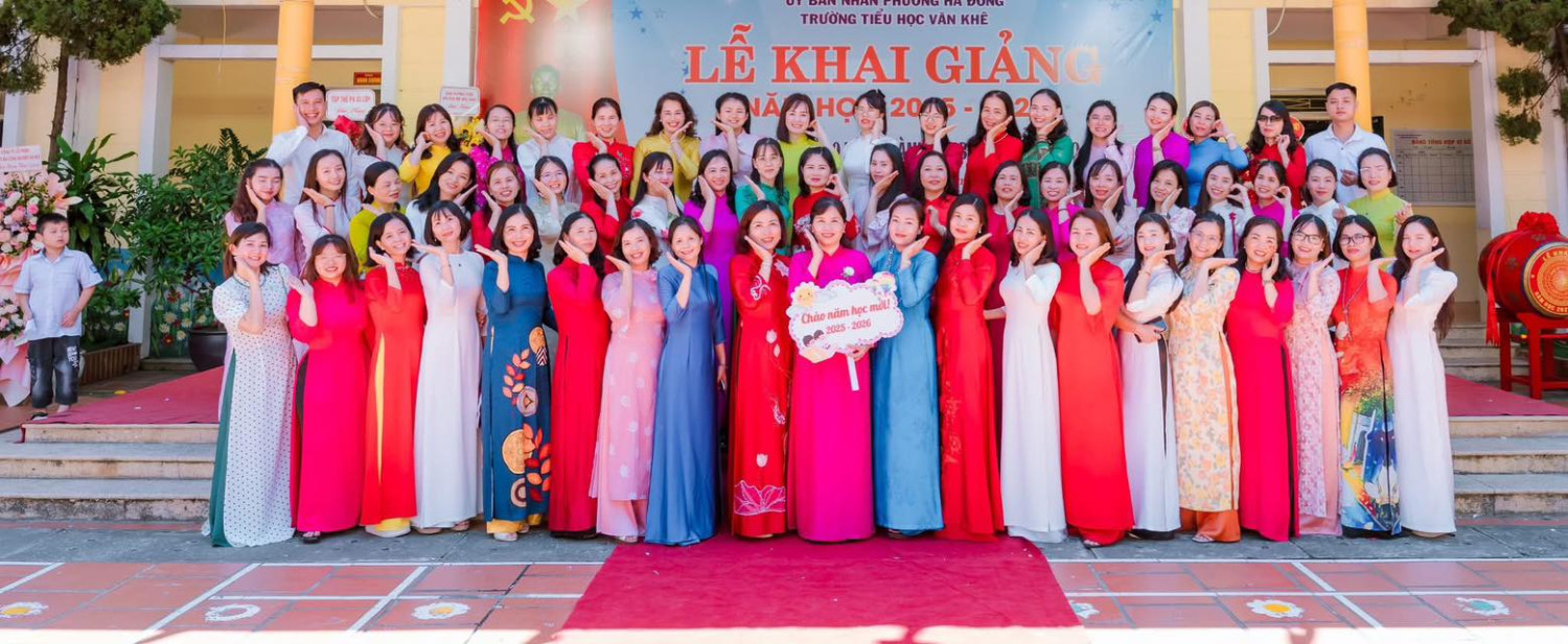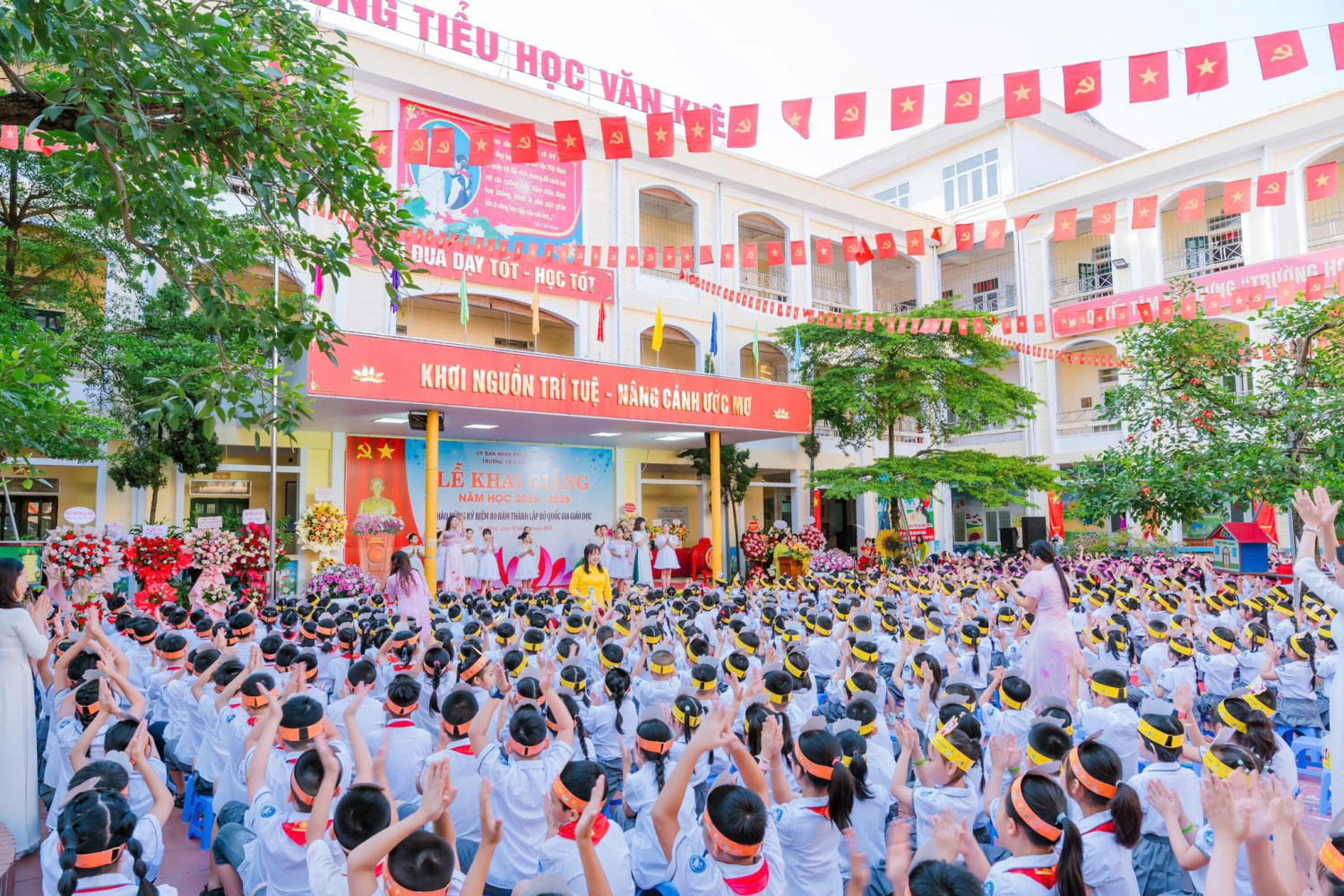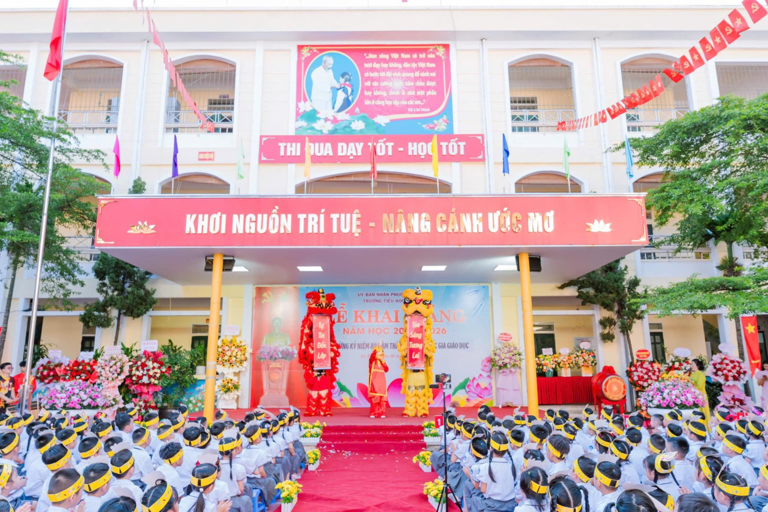 Sớm Thu rộn rã sân trường Cờ đua sắc nắng gió vương trên cành Hàng cây nghiêng bóng mát lành Trống trường rộn rã kết thành lời ca. Sân trường ngập sắc cờ hoa Trò cười ríu rít như là chim non Lễ khai giảng năm học mới 2025-2026. Tiếp sóng Chương trình Lễ kỷ niệm 80 năm thành lập Bộ Quốc gia Giáo dục của trường em ạ