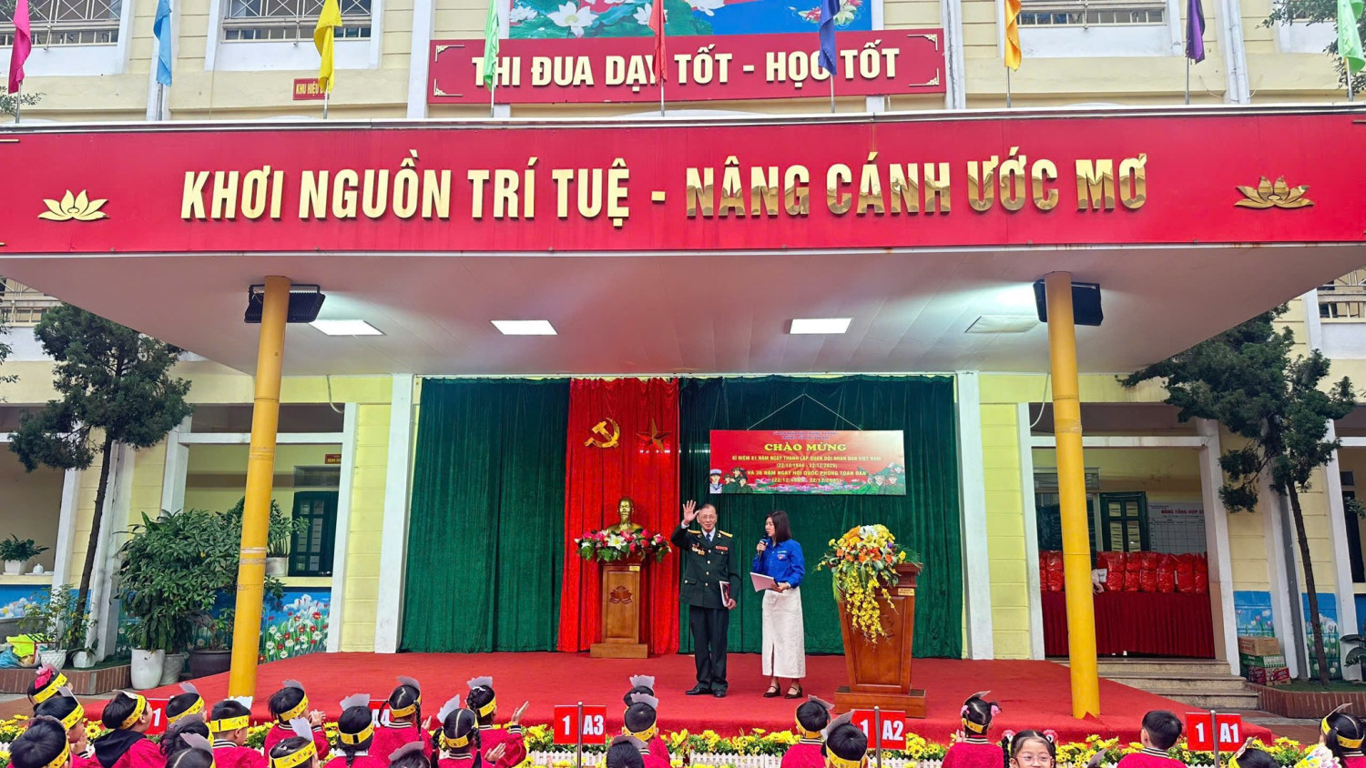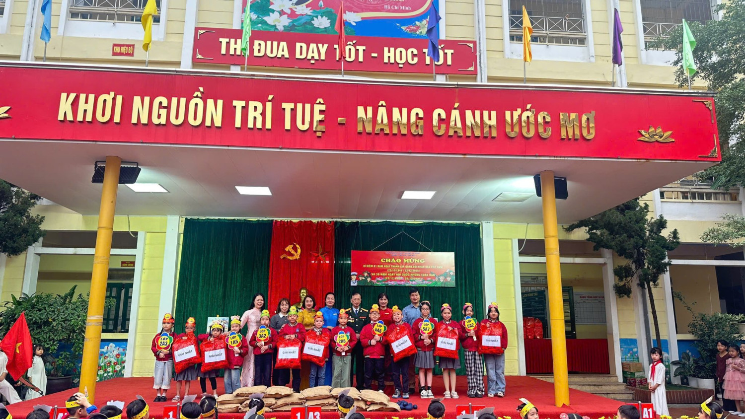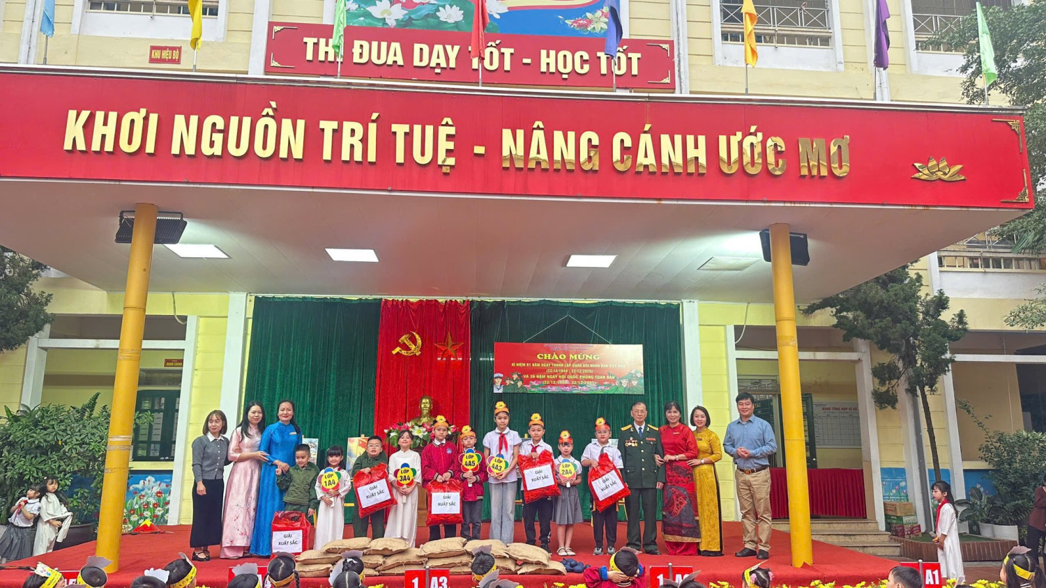 Trong không khí trang nghiêm của những ngày tháng Mười Hai lịch sử, Trường Tiểu học Văn Khê đã long trọng tổ chức các hoạt động kỷ niệm Ngày thành lập Quân đội Nhân dân Việt Nam – đội quân anh hùng từ nhân dân mà ra, vì nhân dân mà chiến đấu. Đây là dịp ý nghĩa để thầy và trò cùng ôn lại truyền thống vẻ vang, bồi đắp lòng yêu nước và niềm tự hào dân tộc cho các em học sinh. Trong khuôn khổ chương trình, nhà trường đã trao giải Nhất và giải Xuất sắc cho các tập thể lớp có phần thể hiện ấn tượng, giàu cảm xúc trong Hội thi Kể chuyện chào mừng ngày 22/12. Những câu chuyện giản dị mà sâu lắng đã khắc họa sinh động hình ảnh người lính Cụ Hồ kiên trung, bất khuất, để lại nhiều dư âm đẹp trong lòng thầy cô, phụ huynh và học sinh. Buổi lễ vinh dự được đón ông Nguyễn Viết Hằng – Nguyên Chủ tịch Hội Cựu chiến binh La Khê, phường Hà Đông đến giao lưu, chia sẻ. Những câu chuyện đời lính mộc mạc, chân thành của bác không chỉ giúp các em học sinh hiểu hơn về lịch sử, mà còn gieo vào lòng các em sự kính trọng, lòng biết ơn và niềm tự hào sâu sắc về truyền thống Quân đội Nhân dân Việt Nam. Đại diện nhà trường, ông Bùi Công Tuyên cùng bà Đỗ Thị Thùy Linh đã trân trọng dâng hoa tri ân bác Nguyễn Viết Hằng, thay cho tình cảm kính trọng và lòng biết ơn sâu sắc của tập thể cán bộ, giáo viên, phụ huynh và học sinh nhà trường đối với những cống hiến của thế hệ cha anh. Tiếp nối ý nghĩa ấy, đại diện phụ huynh và nhà trường đã trao quà chúc mừng các tiết mục đạt giải Xuất sắc và giải Nhất, ghi nhận sự nỗ lực, sáng tạo và tinh thần học tập nghiêm túc của các em học sinh trong hành trình tìm hiểu, gìn giữ và lan tỏa truyền thống vẻ vang của dân tộc. Cùng ngày, đại diện nhà trường đã đến Nghĩa trang liệt sĩ cũ La Khê dâng hương tưởng niệm, thành kính tri ân những anh hùng liệt sĩ đã hiến dâng trọn đời mình cho độc lập, tự do của Tổ quốc. Chuỗi hoạt động kỷ niệm không chỉ là lời tri ân sâu sắc đối với các thế hệ cha anh, mà còn là bài học giáo dục truyền thống đầy ý nghĩa, góp phần bồi đắp tình yêu quê hương, đất nước và khát vọng cống hiến trong trái tim các em học sinh hôm nay – những mầm non của Tổ quốc mai sau. Dưới đây là một số hình ảnh được ghi lại:
