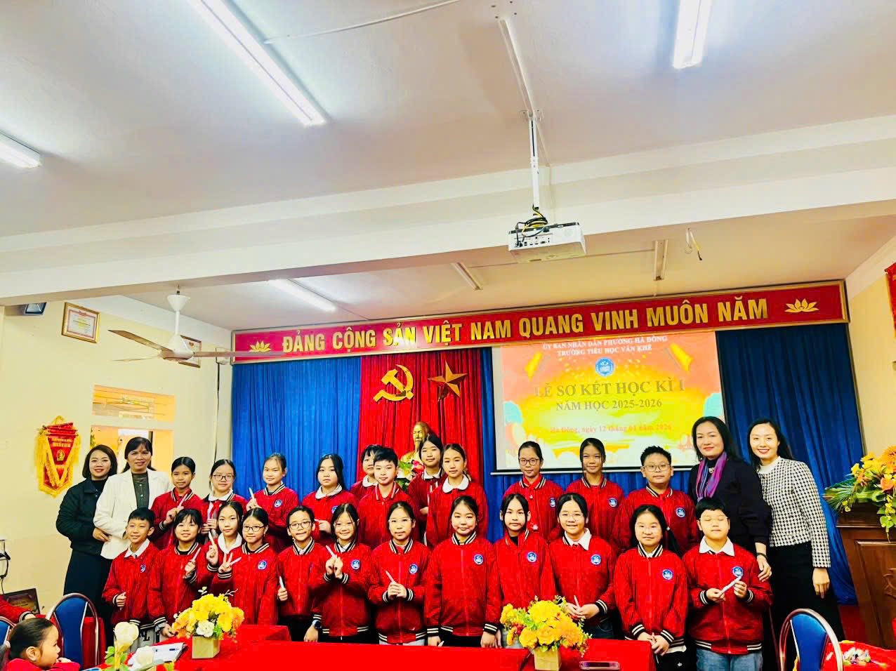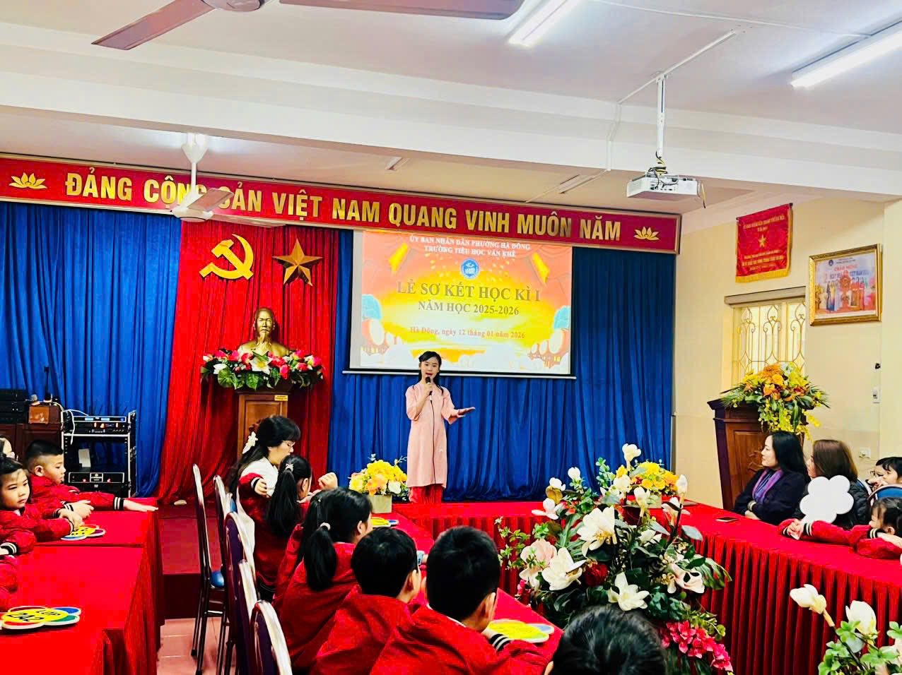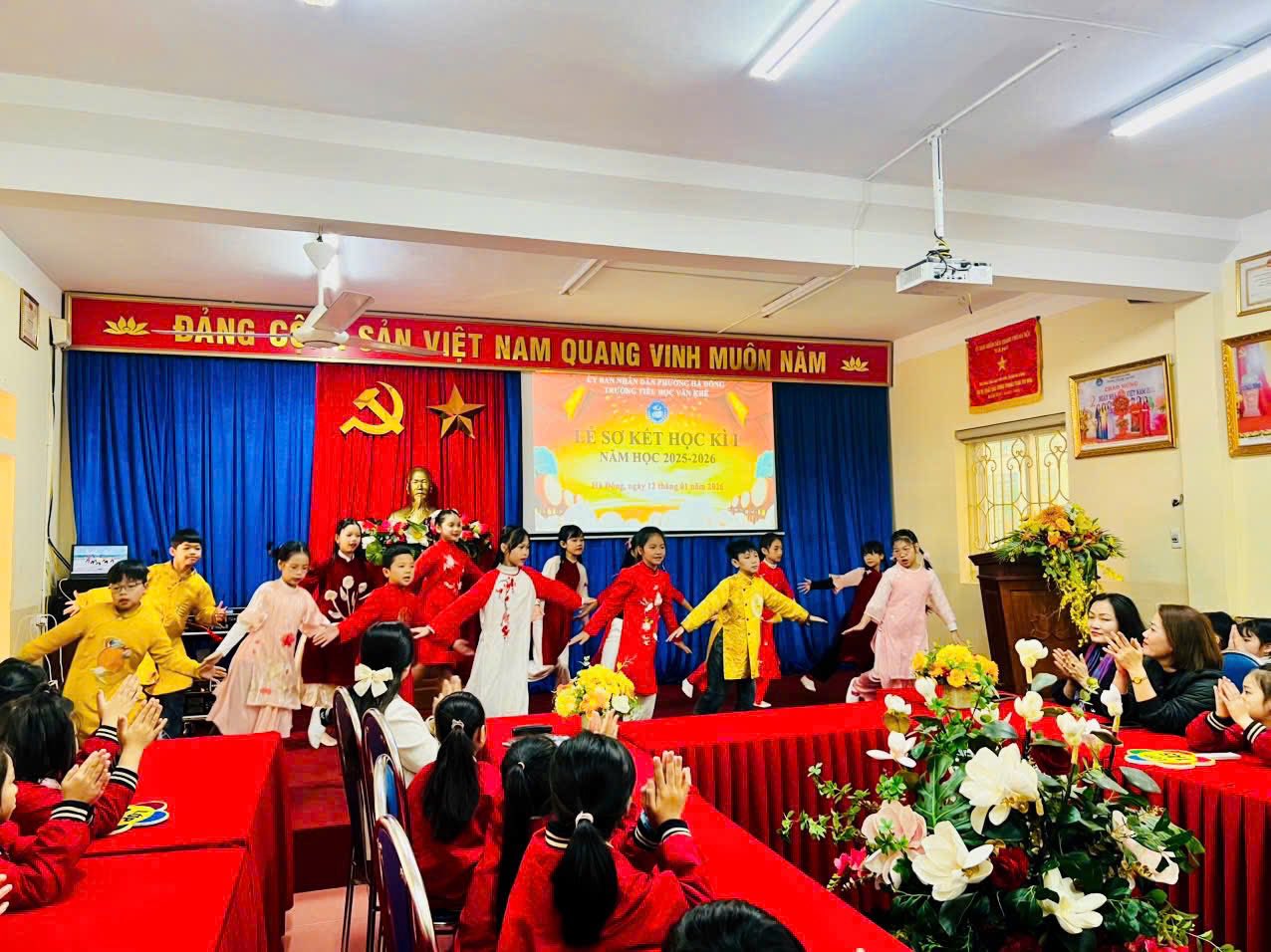 Trong không khí mùa xuân đang về, sáng nay, ngày 12/01/2026, trường Tiểu học Văn Khê đã long trọng tổ chức Lễ sơ kết học kỳ I năm học 2025–2026 tại phòng Hội đồng nhà trường. Buổi lễ diễn ra trang nghiêm với nghi thức chào cờ – Quốc ca – Đội ca, thể hiện niềm tự hào và quyết tâm của thầy trò nhà trường trong việc học tập, rèn luyện theo lý tưởng của Bác Hồ kính yêu. Tại buổi sơ kết, cô giáo Trần Thị Quyên – Bí thư Đảng ủy, Hiệu trưởng nhà trường đã phát biểu ghi nhận những nỗ lực, cố gắng của tập thể cán bộ, giáo viên, nhân viên và học sinh trong học kỳ I. Những kết quả đạt được là minh chứng cho tinh thần đoàn kết, trách nhiệm và sự bền bỉ của thầy và trò Trường Tiểu học Văn Khê trong công tác dạy và học. Chương trình khép lại trong không khí vui tươi, rộn ràng đón xuân với các tiết mục văn nghệ mang sắc màu Tết. Tiếp theo, thầy cô và toàn thể các em học sinh cùng lắng đọng qua câu chuyện vô cùng ý nghĩa Live with kindness and gratitude - Hãy sống có lòng nhân ái và biết ơn do em Hoàng Thảo Nguyên thể hiện. Giọng kể truyền cảm, tiếng Anh lưu loát nhằm lan toả lòng nhân ái, tình yêu thương và cùng nhau xây dựng môi trường học tập, làm việc, môi trường sống thật hạnh phúc. Qua bài thuyết trình của Thảo Nguyên nhà trường mong muốn các em học sinh luôn tự tin, luôn chăm chỉ học tập mỗi ngày nhé! Sơ kết học kỳ I là dịp nhìn lại những nỗ lực đã qua, đồng thời tạo động lực để Trường Tiểu học Văn Khê vững vàng bước tiếp, phấn đấu hoàn thành tốt nhiệm vụ năm học 2025–2026.