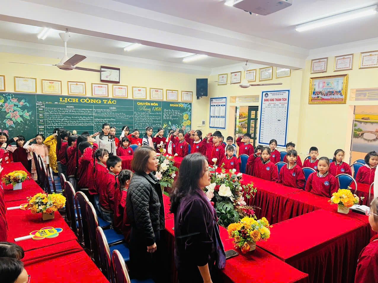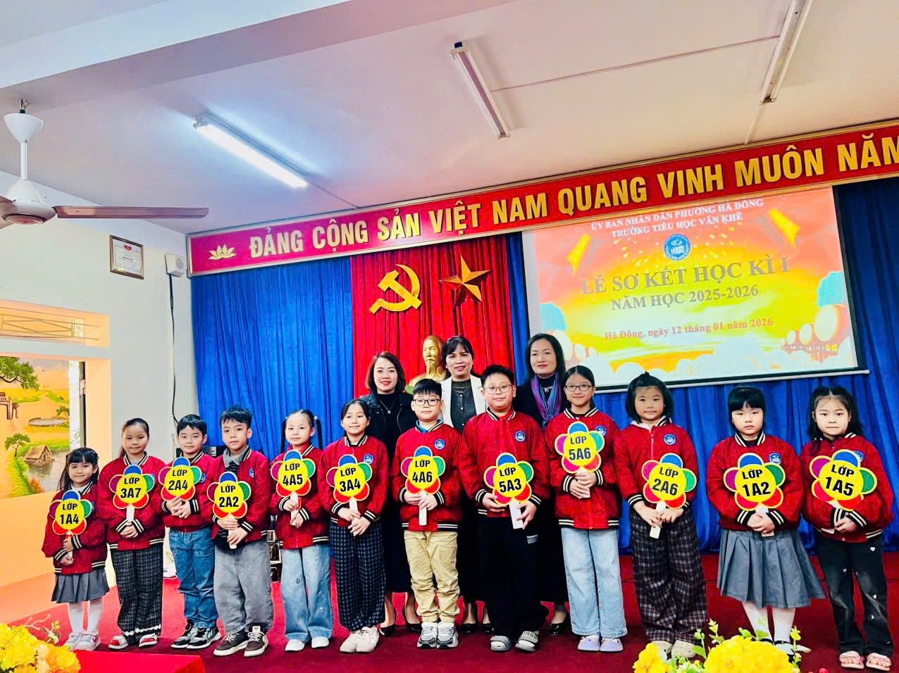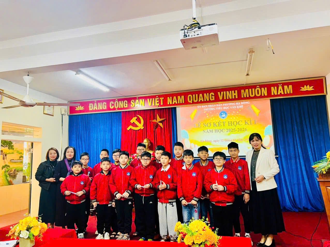 Trong không khí mùa xuân đang về, sáng nay, ngày 12/01/2026, trường Tiểu học Văn Khê đã long trọng tổ chức Lễ sơ kết học kỳ I năm học 2025–2026 tại phòng Hội đồng nhà trường. Buổi lễ diễn ra trang nghiêm với nghi thức chào cờ – Quốc ca – Đội ca, thể hiện niềm tự hào và quyết tâm của thầy trò nhà trường trong việc học tập, rèn luyện theo lý tưởng của Bác Hồ kính yêu. Tại buổi sơ kết, cô giáo Trần Thị Quyên – Bí thư Đảng ủy, Hiệu trưởng nhà trường đã phát biểu ghi nhận những nỗ lực, cố gắng của tập thể cán bộ, giáo viên, nhân viên và học sinh trong học kỳ I. Những kết quả đạt được là minh chứng cho tinh thần đoàn kết, trách nhiệm và sự bền bỉ của thầy và trò Trường Tiểu học Văn Khê trong công tác dạy và học. Chương trình khép lại trong không khí vui tươi, rộn ràng đón xuân với các tiết mục văn nghệ mang sắc màu Tết. Tiếp theo, thầy cô và toàn thể các em học sinh cùng lắng đọng qua câu chuyện vô cùng ý nghĩa Live with kindness and gratitude - Hãy sống có lòng nhân ái và biết ơn do em Hoàng Thảo Nguyên thể hiện. Giọng kể truyền cảm, tiếng Anh lưu loát nhằm lan toả lòng nhân ái, tình yêu thương và cùng nhau xây dựng môi trường học tập, làm việc, môi trường sống thật hạnh phúc. Qua bài thuyết trình của Thảo Nguyên nhà trường mong muốn các em học sinh luôn tự tin, luôn chăm chỉ học tập mỗi ngày nhé! Sơ kết học kỳ I là dịp nhìn lại những nỗ lực đã qua, đồng thời tạo động lực để Trường Tiểu học Văn Khê vững vàng bước tiếp, phấn đấu hoàn thành tốt nhiệm vụ năm học 2025–2026.