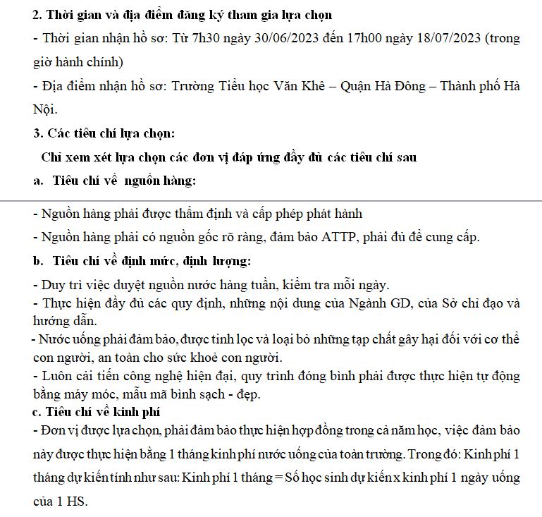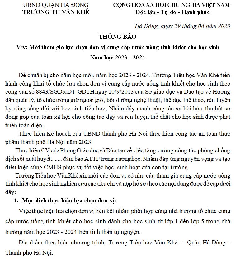 Thông báo: Mời tham gia lựa chọn đơn vị cung cấp nước uống tinh khiết cho học sinh Năm học 2023 - 2024
