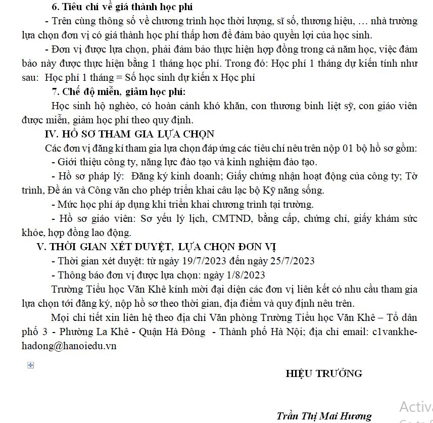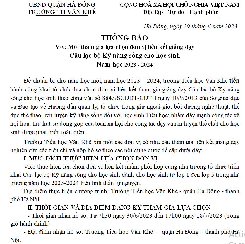 Thông báo: Mời tham gia lựa chọn đơn vị liên kết giảng dạy Câu lạc bộ Kỹ năng sống cho học sinh Năm học 2023 - 2024
