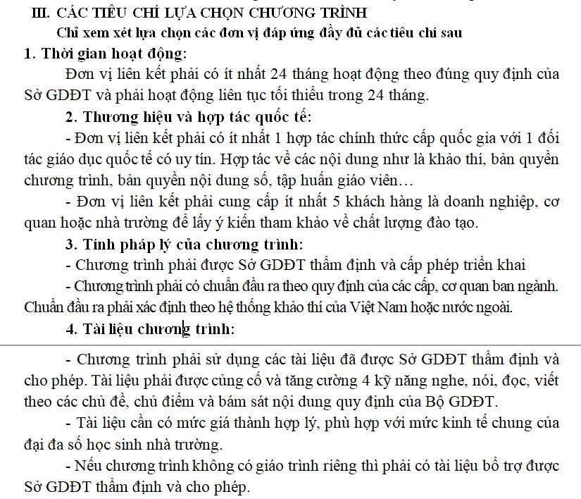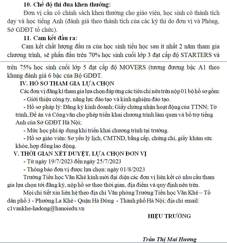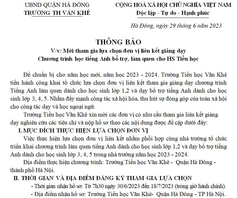 Thông báo: Mời tham gia lựa chọn đơn vị liên kết giảng dạy  Chương trình học tiếng Anh bổ trợ, làm quen cho học sinh Tiểu học
