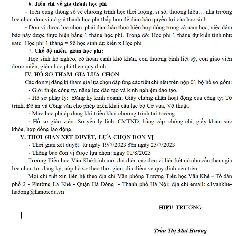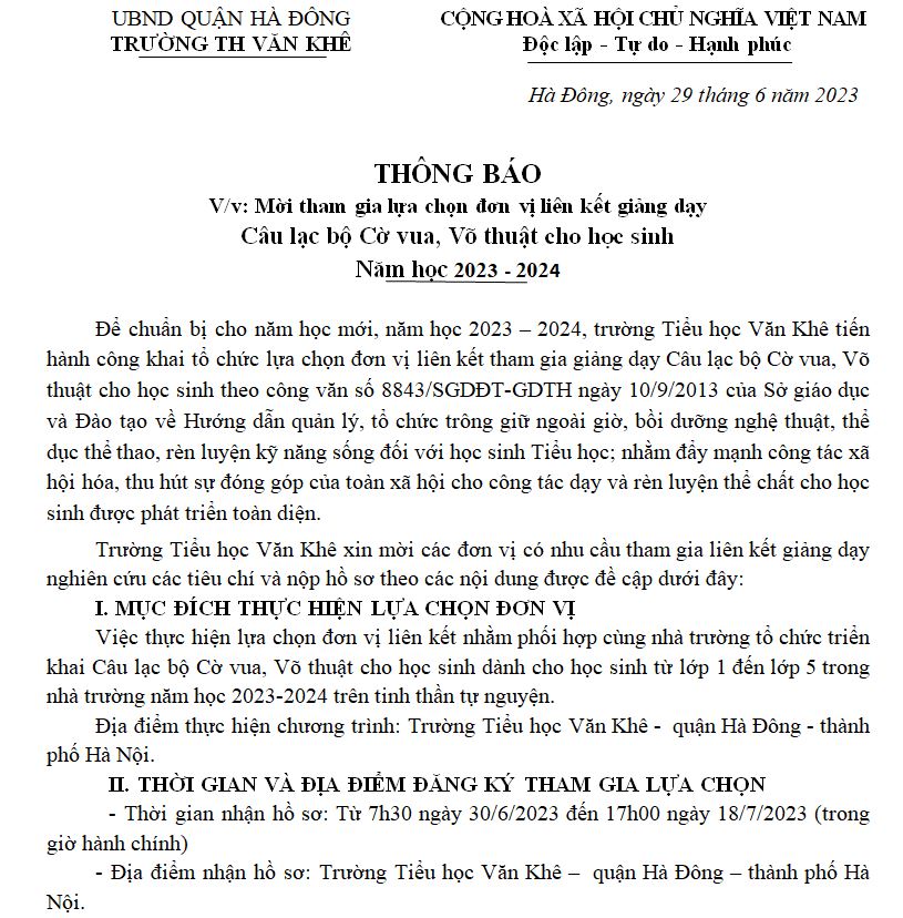 Thông báo: Mời tham gia lựa chọn đơn vị liên kết giảng dạy CLB cờ vua, võ thuật cho học sinh năm học 2023-2024