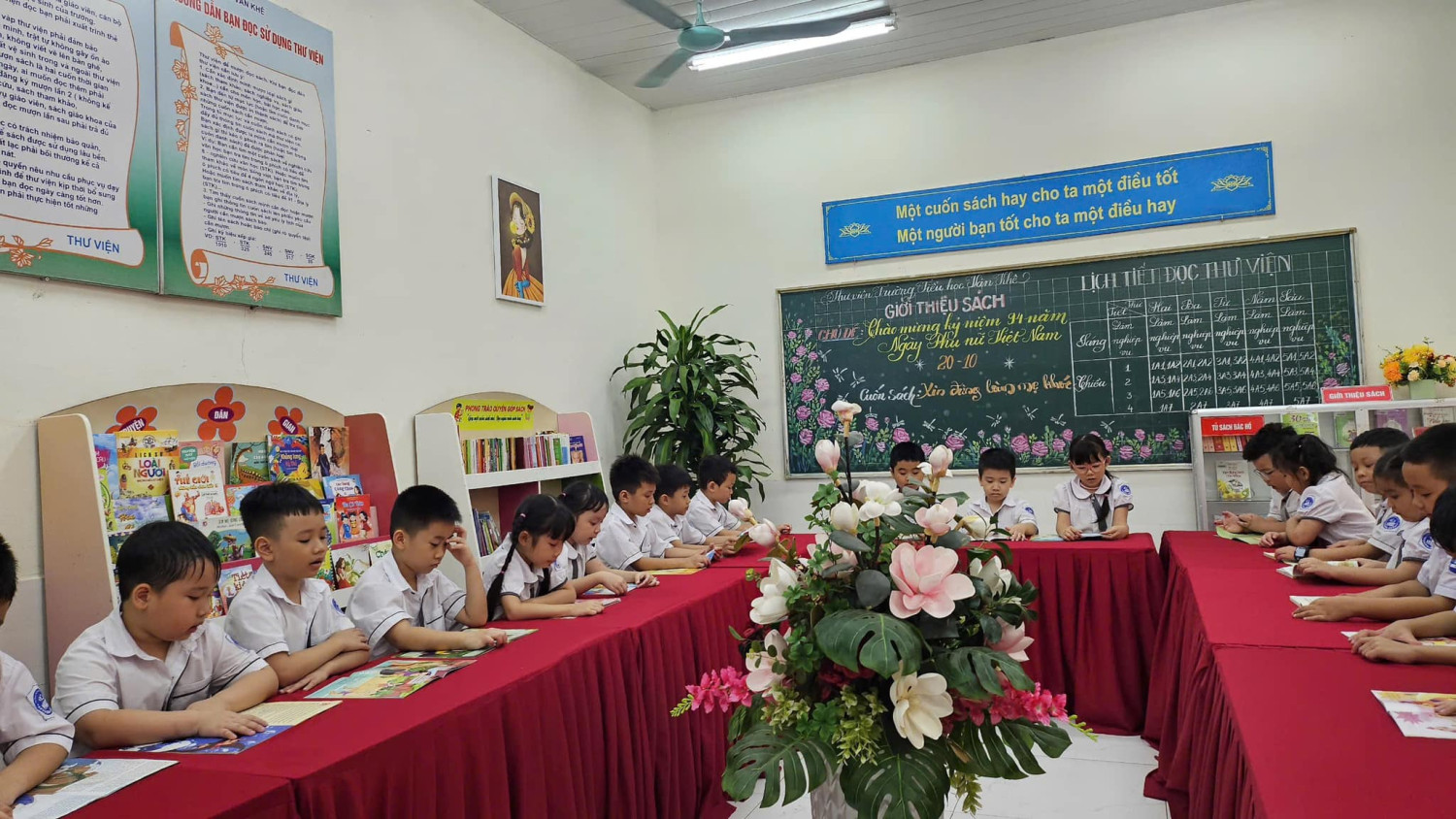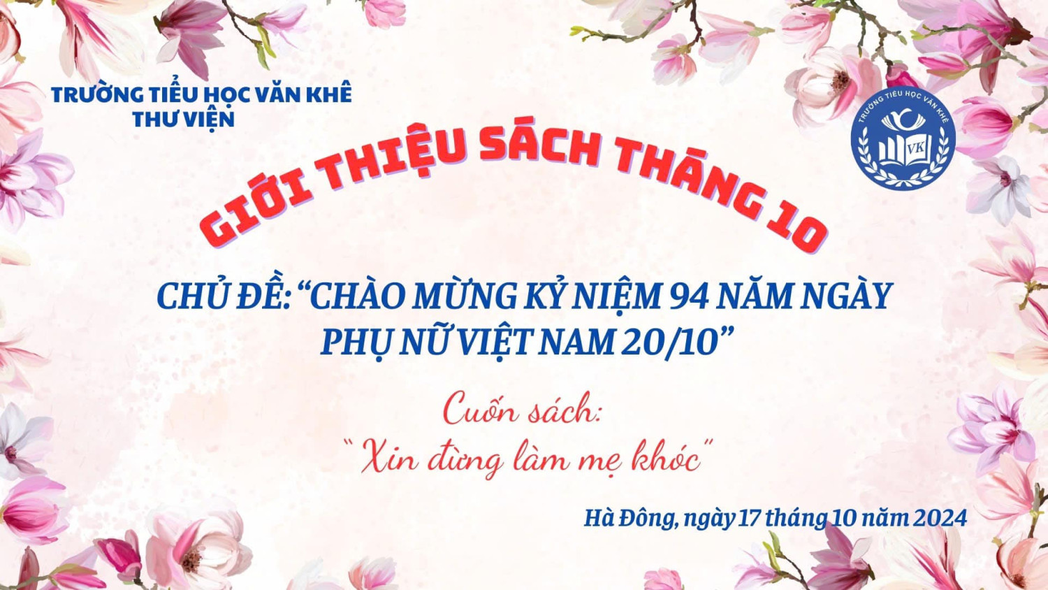 Chuỗi hoạt động Chào mừng ngày Phụ nữ Việt Nam 20/10/2024 Nhà trường đã tổ chức nhiều hoạt động nhằm TÔN VINH vai trò và sự cống hiến của phụ nữ Việt Nam trong mọi lĩnh vực của đời sống xã hội. Đồng thời giáo dục cho học sinh LÒNG BIẾT ƠN, TRÂN TRỌNG những người phụ nữ thân yêu của mình đó là mẹ, là bà, là cô giáo,… Dưới đây là hoạt động tuyên truyền "Giới thiệu sách tháng 10" với chủ đề: Chào mừng kỷ niệm 94 năm ngày Phụ nữ Việt Nam 20/10 tại không gian từng lớp học và trong Thư Viện của nhà trường. Xin kính mời quý vị vào xem ạ!