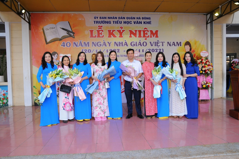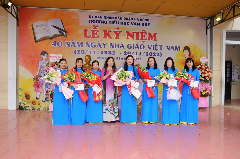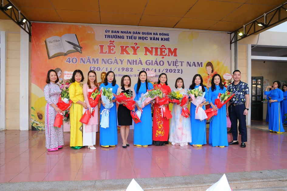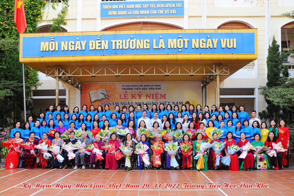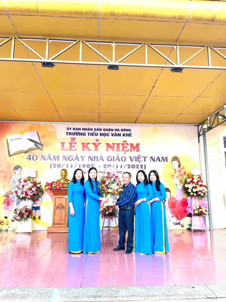 Hoà chung không khí của cả nước sôi nổi hướng về ngày nhà giáo Việt Nam 20/11. Sáng ngày 18 /11/2022, trường Tiểu học Văn Khê đã long trọng tổ chức lễ mít tinh kỉ niệm 40 năm ngày Nhà giáo Việt Nam (20/11/1982 - 20/11/2022). Đến dự với buổi lễ, nhà trường rất vinh dự đón tiếp đoàn đại biểu đại diện cho Đảng ủy – UBND - UBMTTQ, các ban ngành đoàn thể, các đơn vị đóng trên địa bàn phường La Khê, các nhà giáo lão thành, đại diện hội cha mẹ học sinh cùng đông đảo các thầy cô giáo và hơn 1800 em học sinh trong trường. Trong diễn văn khai mạc, đ/c Trần Thị Mai Hương – Bí thư Chi bộ - Hiệu trưởng nhà trường đã cùng ôn lại ý nghĩa của ngày 20/11và tổng kết, đánh giá hoạt động thi đua chào mừng ngày Nhà giáo VN, tri ân thế hệ các Nhà giáo đi trước, động viên và khuyến khích các giáo viên trẻ tiếp tục phấn đấu vì sự nghiệp trồng người. Em Trịnh Hương Giang – học sinh lớp 5D, thay mặt cho các bạn học sinh trong nhà trường nói lên lòng biết ơn sâu sắc của học trò đối với công ơn thầy cô và kính tặng bó hoa tươi thắm tới các thầy cô giáo. Buổi kỷ niệm 40 năm ngày Nhà giáo Việt Nam đã kết thúc trong không khí hân hoan và ấm áp tình cảm nhà trường. Những bông hoa, những lời ca và những lời chúc của các em học sinh là món quà vô giá dành tặng và tôn vinh thầy cô - những người tận tuỵ ươm mầm xanh trí tuệ cho thế hệ tương lai. Một số hình ảnh của buổi lễ: