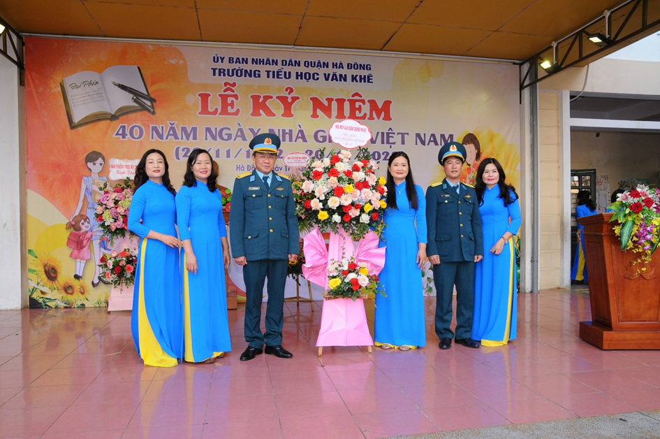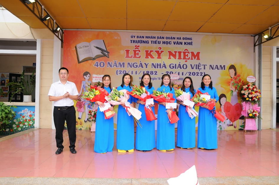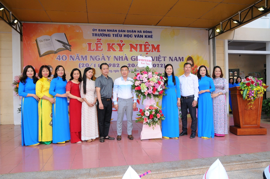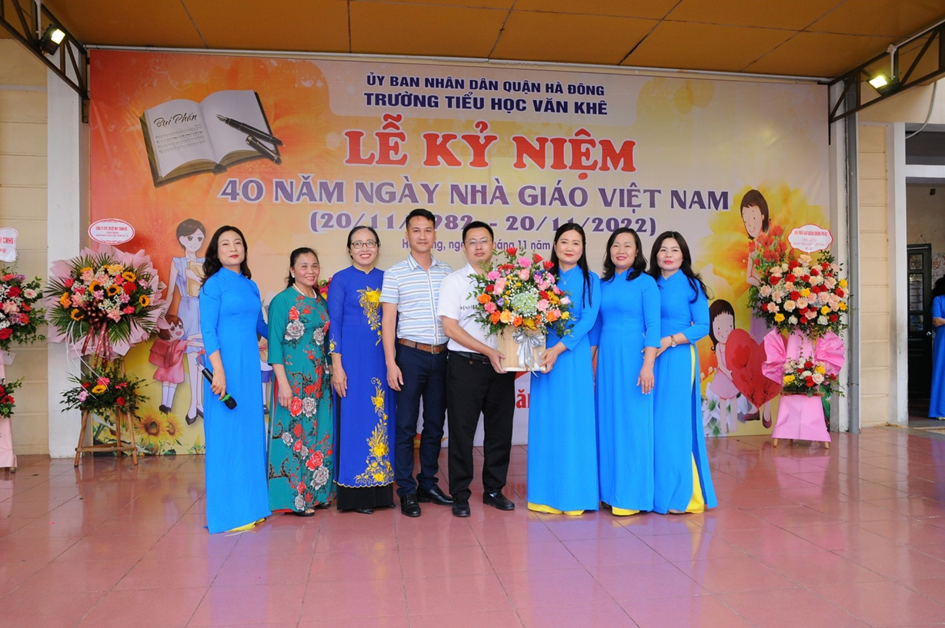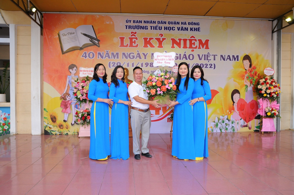 Hoà chung không khí của cả nước sôi nổi hướng về ngày nhà giáo Việt Nam 20/11. Sáng ngày 18 /11/2022, trường Tiểu học Văn Khê đã long trọng tổ chức lễ mít tinh kỉ niệm 40 năm ngày Nhà giáo Việt Nam (20/11/1982 - 20/11/2022). Đến dự với buổi lễ, nhà trường rất vinh dự đón tiếp đoàn đại biểu đại diện cho Đảng ủy – UBND - UBMTTQ, các ban ngành đoàn thể, các đơn vị đóng trên địa bàn phường La Khê, các nhà giáo lão thành, đại diện hội cha mẹ học sinh cùng đông đảo các thầy cô giáo và hơn 1800 em học sinh trong trường. Trong diễn văn khai mạc, đ/c Trần Thị Mai Hương – Bí thư Chi bộ - Hiệu trưởng nhà trường đã cùng ôn lại ý nghĩa của ngày 20/11và tổng kết, đánh giá hoạt động thi đua chào mừng ngày Nhà giáo VN, tri ân thế hệ các Nhà giáo đi trước, động viên và khuyến khích các giáo viên trẻ tiếp tục phấn đấu vì sự nghiệp trồng người. Em Trịnh Hương Giang – học sinh lớp 5D, thay mặt cho các bạn học sinh trong nhà trường nói lên lòng biết ơn sâu sắc của học trò đối với công ơn thầy cô và kính tặng bó hoa tươi thắm tới các thầy cô giáo. Buổi kỷ niệm 40 năm ngày Nhà giáo Việt Nam đã kết thúc trong không khí hân hoan và ấm áp tình cảm nhà trường. Những bông hoa, những lời ca và những lời chúc của các em học sinh là món quà vô giá dành tặng và tôn vinh thầy cô - những người tận tuỵ ươm mầm xanh trí tuệ cho thế hệ tương lai. Một số hình ảnh của buổi lễ: