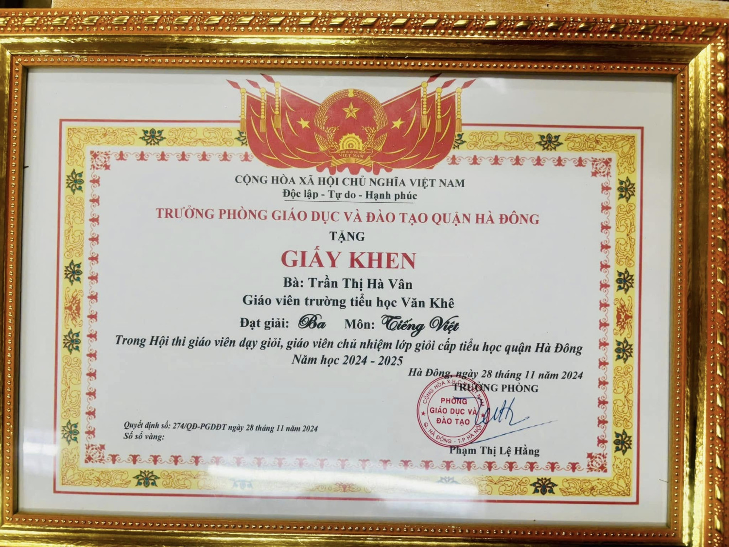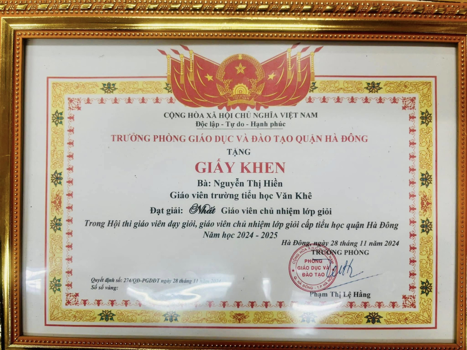ẩy mạnh phong trào thi đua dạy - học, khuyến khích, động viên, tạo cơ hội rèn luyện, sáng tạo, học hỏi, trao đổi kinh nghiệm trong công tác giảng dạy đối với giáo viên. Rất vinh dự cho Trường Tiểu học học Văn Khê tham gia đầy đủ cả 3 môn thi và đều xuất sắc đạt giải. Cô giáo Nguyễn Thị Hiền xuất sắc đạt giải NHẤT cô giáo Nguyễn Thị Chang đạt giải NHÌ cô giáo Trần Thị Hà Vân đạt giải BA giáo viên dạy giỏi Trường tiểu học Văn Khê xin trân trọng cảm ơn các đ/c Lãnh đạo, chuyên viên Phòng GDĐT đã tổ chức Hội thi rất khoa học. Cảm ơn trường Tiểu học Văn Yên, Tiểu học Lê Quý Đôn đã tạo điều kiện tốt nhất cho các cô giáo thực hiện thành công tiết dạy của mình. Xin ghi nhận và cảm ơn các thành viên trong tổ tư vấn miệt mài đóng góp ý tưởng cho kế hoạch bài dạy. Cảm ơn những đóng góp thầm lặng của tập thể BGH, GV, NV nhà trường góp phần rất lớn cho công tác dạy- học, công tác bán trú và các hoạt động văn thể mỹ của nhà trường để Tiểu học Văn Khê LUÔN LÀ ĐIỂM ĐẾN TIN CẬY của Quý Phụ huynh gửi gắm con em mình. Dưới đây là 1 số hình ảnh được ghi nhận. Xin mời quý vị vào xem ạ!