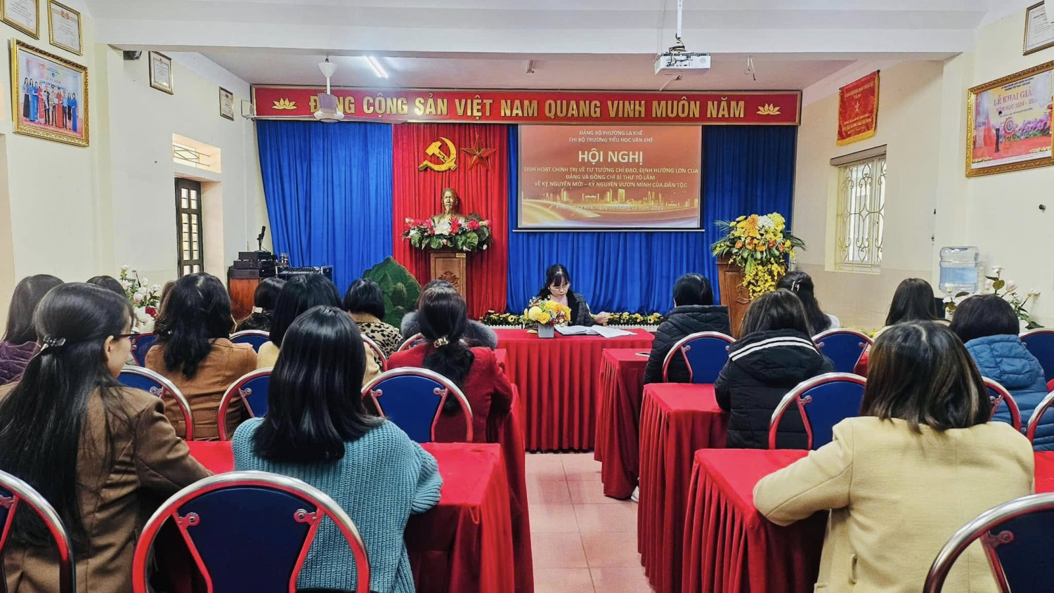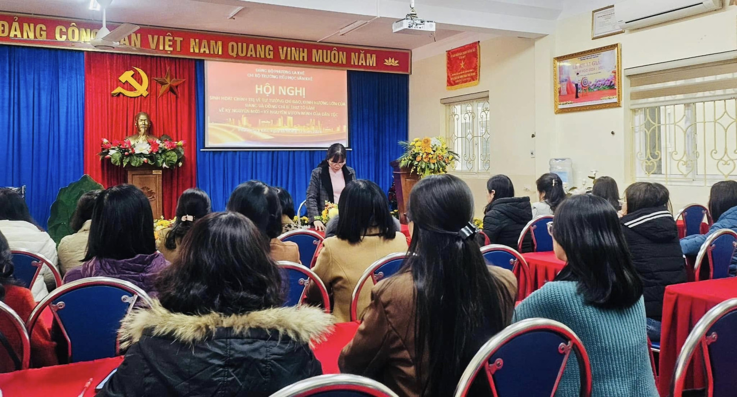 Thực hiện Kế hoạch số 332 - KH/QU, ngày 05/12/2024 của Quận uỷ Hà Đông; Công văn số 3377-CV/QU ngày 13/12/2024 của Quận uỷ; Hướng dẫn số 140-HD/BTGQU của Ban Tuyên giáo Quận uỷ về Triển khai đợt sinh hoạt chính trị: “Nghiên cứu, quán triệt tư tưởng chỉ đạo, định hướng lớn của Đảng và đồng chí Tổng Bí thư Tô Lâm về kỷ nguyên mới - kỷ nguyên vươn mình của dân tộc” Ngày 16/12/2024, Chi bộ Trường Tiểu học Văn Khê trực thuộc Đảng bộ phường La Khê đã triển khai đợt sinh hoạt chính trị “Nghiên cứu, quán triệt, tuyên truyền tư tưởng chỉ đạo, định hướng lớn của Đảng và đồng chí Tổng Bí thư Tô Lâm về kỷ nguyên mới - kỷ nguyên vươn mình của dân tộc”. Đây là đợt sinh hoạt chính trị sâu rộng trong toàn chi bộ và có ý nghĩa thiết thực giúp cán bộ, đảng viên, giáo viên, nhân viên nhà trường nhận thức sâu sắc về các quan điểm chỉ đạo, những chủ trương, quyết sách lớn của Đảng và Tổng Bí thư Tô Lâm. Dưới đây là một số hình ảnh về đợt sinh hoạt chính trị “Nghiên cứu, quán triệt, tuyên truyền tư tưởng chỉ đạo, định hướng lớn của Đảng và đồng chí Tổng Bí thư Tô Lâm về kỷ nguyên mới - kỷ nguyên vươn mình của dân tộc” tại Chi bộ Trường Tiểu học Văn Khê